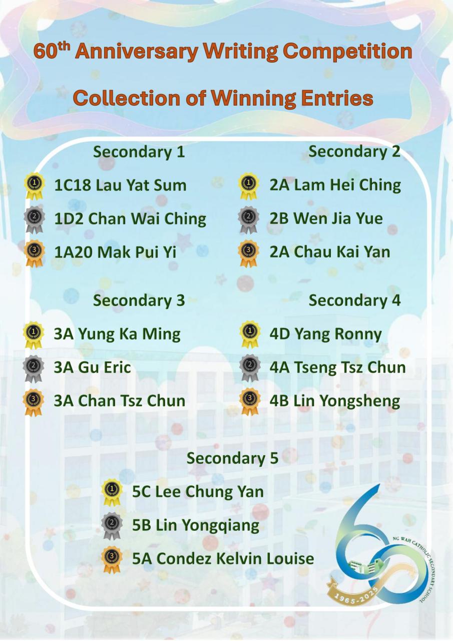 「三、二、一!伍華六十周年校慶開幕禮即將舉行!」主人跟隨司儀的聲線變化而變得雀躍起來,我看着無數華麗耀眼的彩帶在禮堂裏四處飄揚,神聖柔和的音樂在禮堂裏徘徊,一時間場面極其盛大。我和主人成為了這個歷史時刻的見證者。除此之外,主人也是風紀團隊中的一員,他主動幫助老師,也主動解答來賓的疑問。隨着主人不斷在校園的奔波,他身上的汗水也不斷滴落,慢慢潤濕了我。