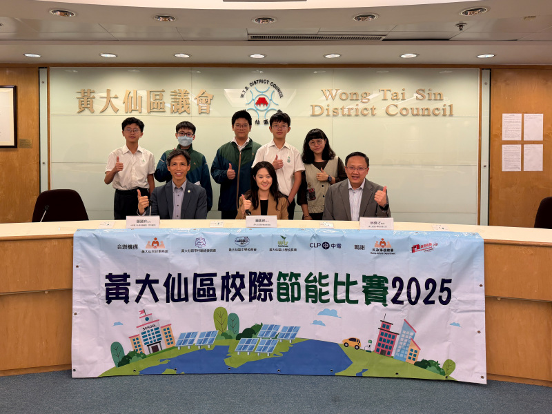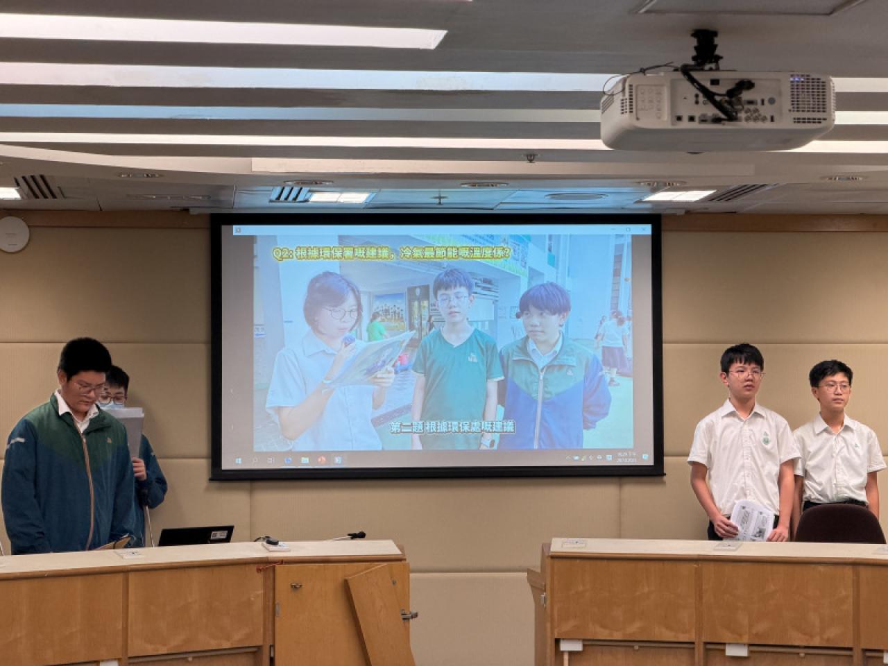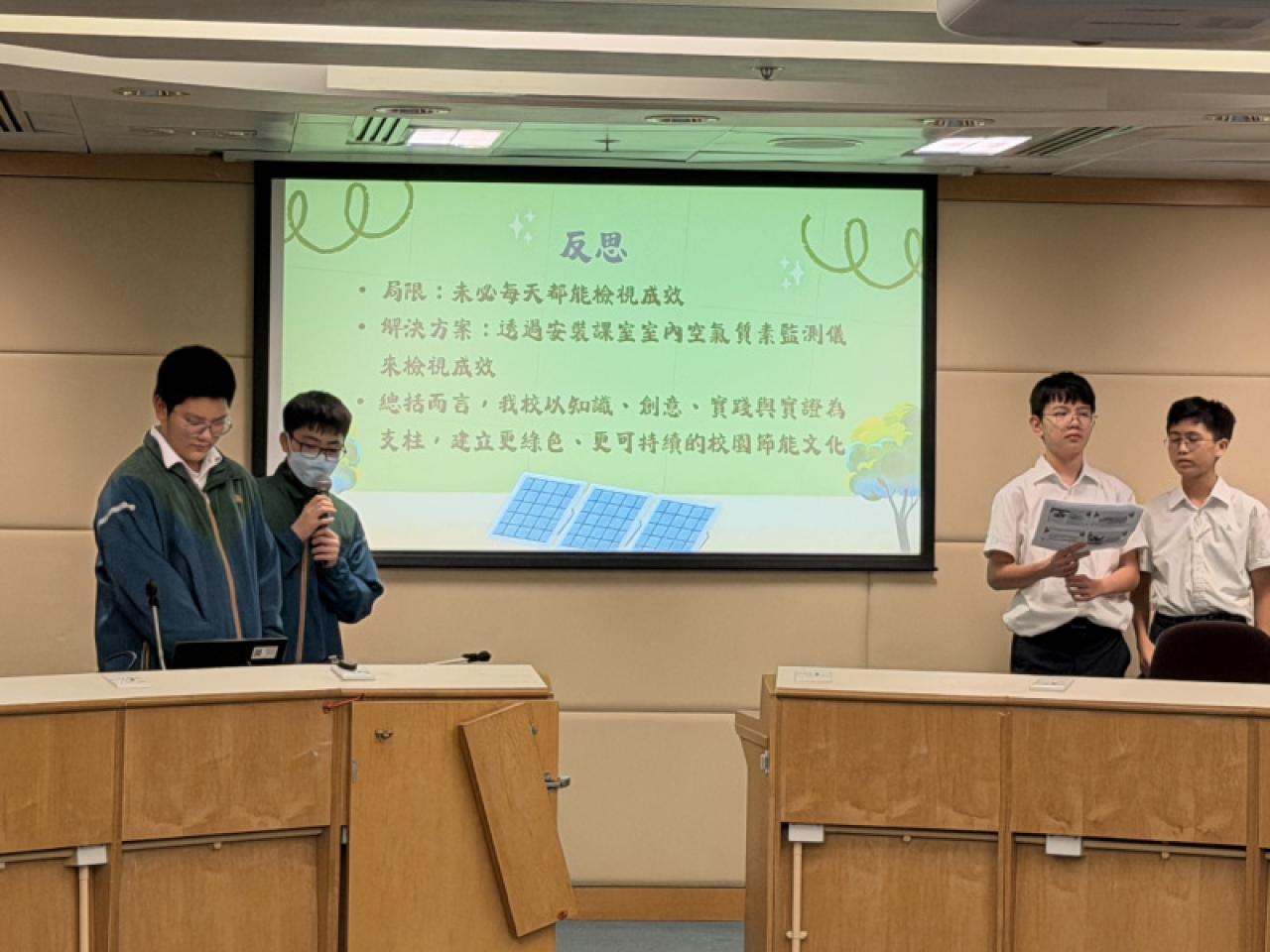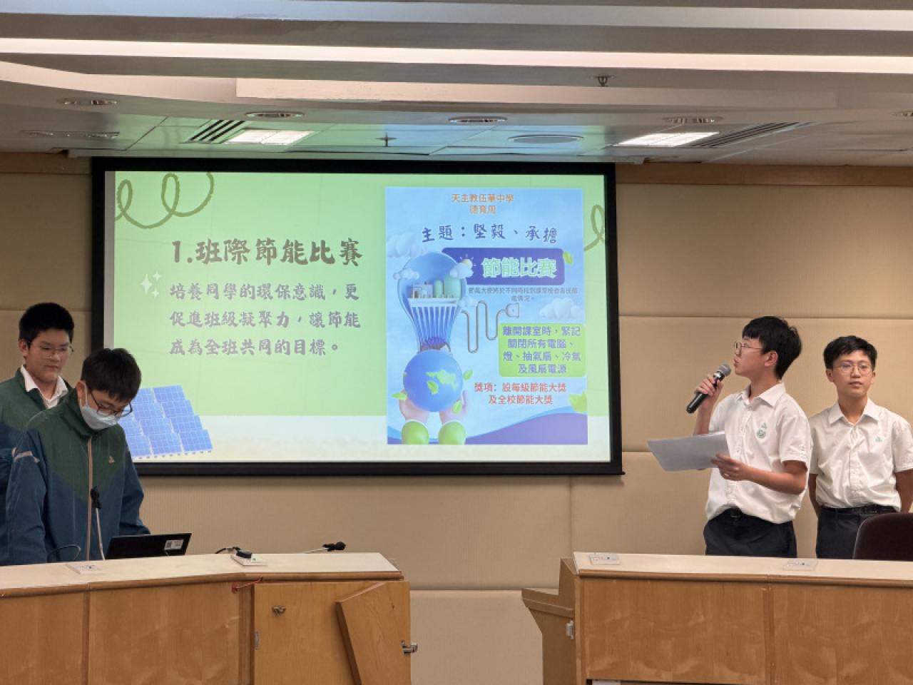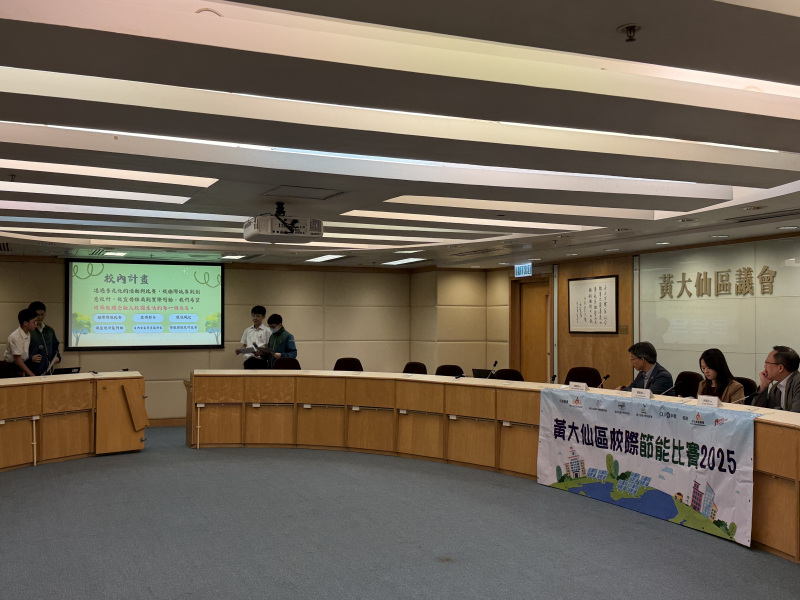 本校節能大使於「黃大仙區校際節能比賽」中分享校內如何運用節能知識、創意宣傳及多項實踐活動,配合室內空氣監測儀,以實證推動綠色校園,建立可持續的節能文化。