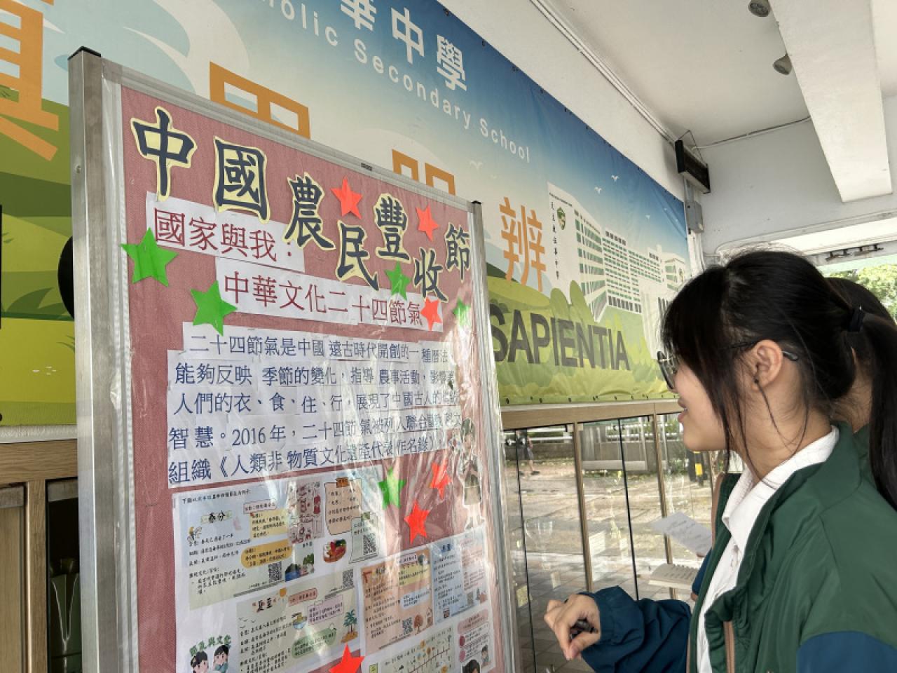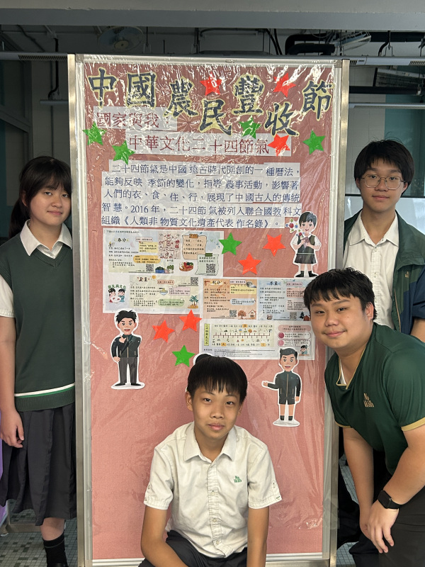 2025-09-25 中國農民豐收節 為讓同學對「中國農民豐收節」有更多的認識,輔導老師與輔導小組同學於26/9早會向全校師生簡述「中國農民豐收節」,這節慶旨在慶祝農作物豐收,感謝勞動與自然的恩賜;藉此提醒同學們應尊重農民,珍惜糧食,傳承中華農耕文化。此外,同學們亦製作有關展板及安排有獎問答遊戲,推動國安教育,讓同學了解維護糧食安全的重要性。 活動剪影