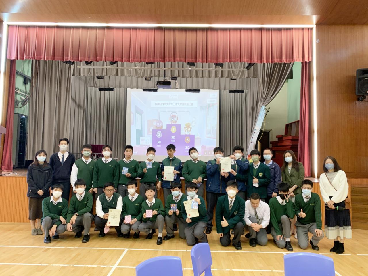 2023-03-03 中文周於1/3-3/3 午膳時段舉行初中問答比賽,每班派出班代表出賽 ,比賽分必答題及搶答題兩個回合,必答題以日常課文問答及語文知 識為主,搶答題則圍繞香港文學作家。當天同學表現認真投入,亦有 不少同學到場打氣,氣氛熱鬧。各級得獎班別:中一級中二級中三級冠軍亞軍季軍殿軍中一丁班中一乙班中一甲班中一丙班冠軍亞軍季軍殿軍中二甲班中二丙班中二丁班中二乙班冠軍亞軍季軍殿軍中三丁班中三乙班中三丙班中三甲班 活動剪影