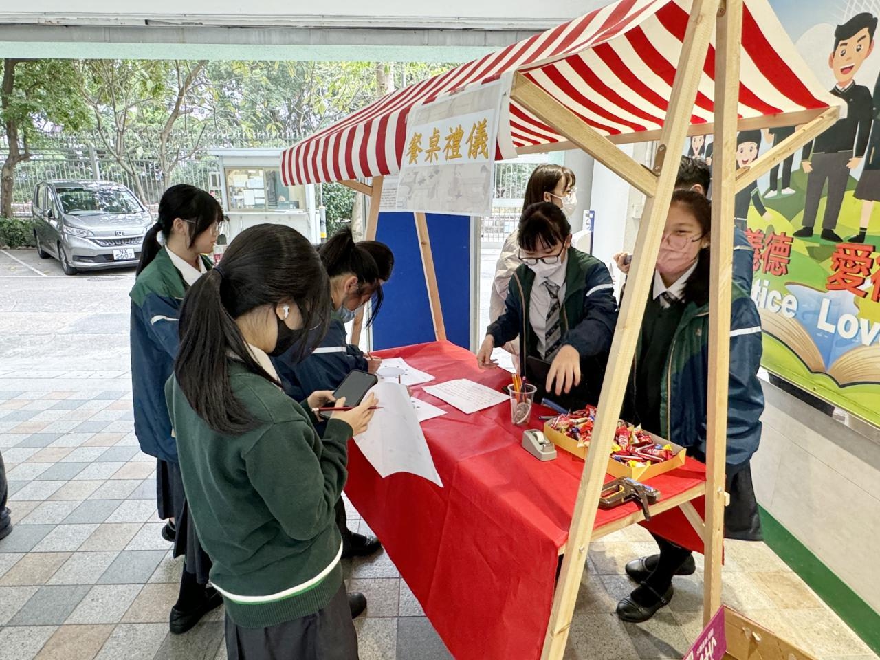 中文科於2月28日午膳時段為同學們舉辦了「認識中國飲食禮儀與器具」的活動,透過展板與攤位遊戲向同學們講解日常用餐時應注意的各種規矩,及其背後蘊含的文化意義。