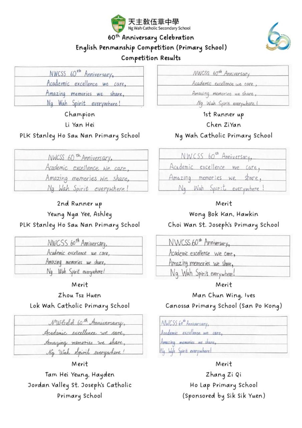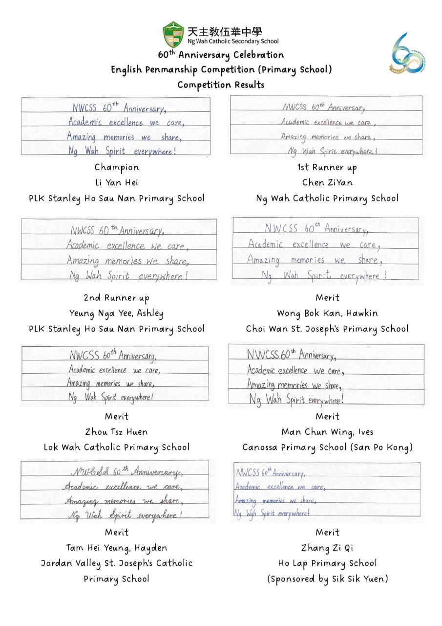 為慶祝鑽禧校慶及弘揚中文書法藝術及書寫風氣,本校邀請多所小學參與中文及英文硬筆書法比賽,比賽結果及得獎作品可參閱附件。