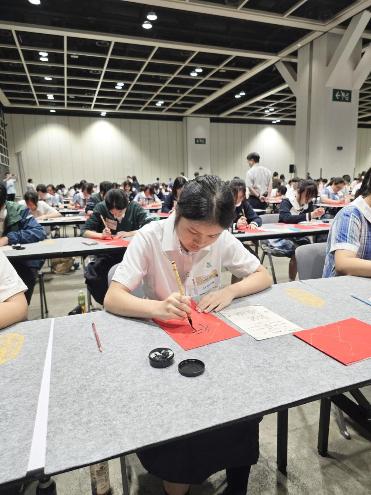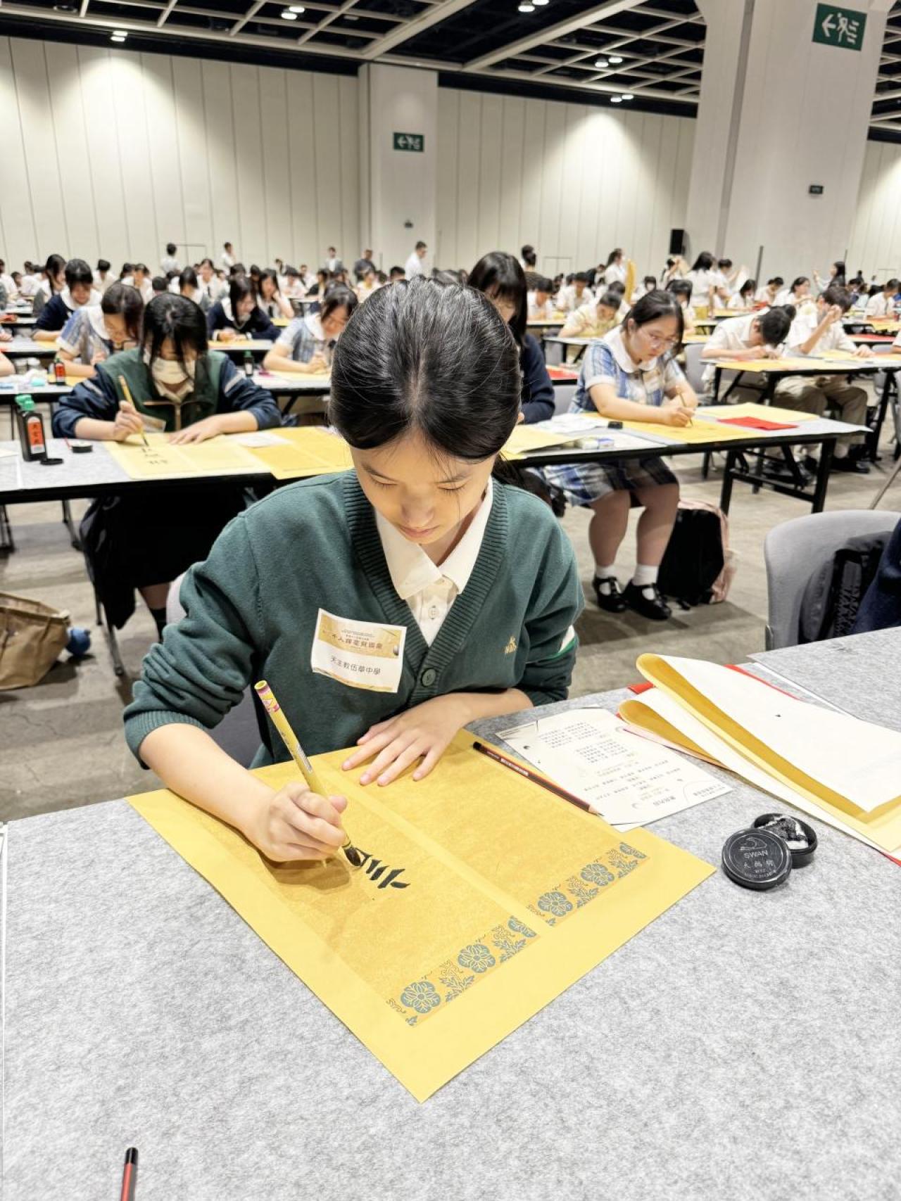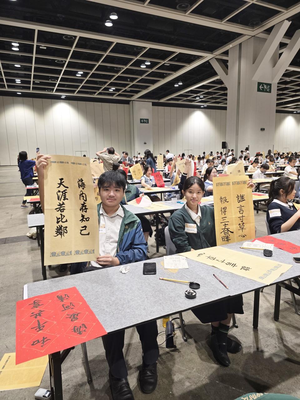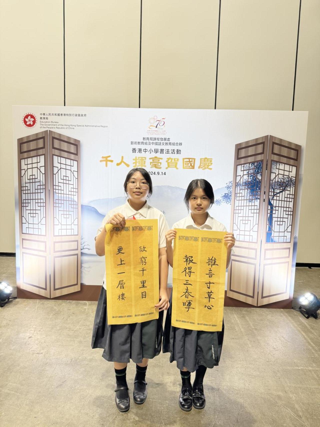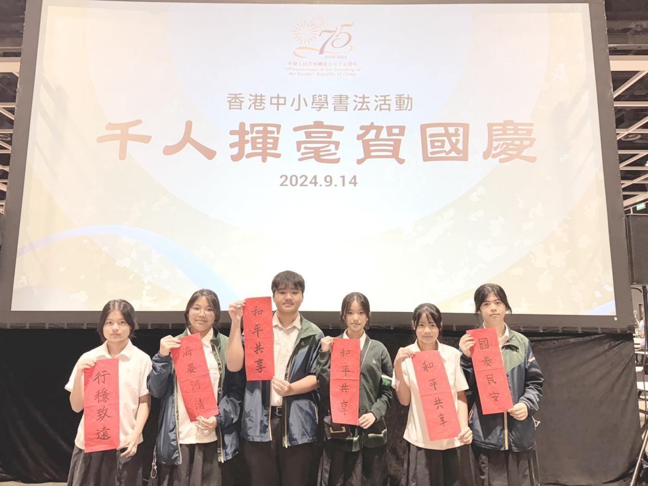 本校於2024年9月14日參加由教育局舉辦的「千人揮毫賀國慶」活動,慶祝中華人民共和國成立75周年。是次活動分別有2C班何麗雯,2D班林紫微,以及3B班歐陽天慈、李熙兒、李芷殷及梁梓洋同學參與。 活動逾1800名來自142所中小學的學生齊聚一堂,與300位校長、教師及嘉賓一同揮毫。署理教育局局長施俊輝先生在致辭中強調書法藝術作為中華文化瑰寶的重要性。本校學生書寫「國泰民安」、「和平共享」等祝福字詞,以及詩句,不僅展現了對書法藝術的熱愛,更表達了對祖國的祝福。 是次活動不僅讓學生們親身體驗中華文化的魅力,也培養了他們的文化素養和愛國情懷。本校將繼續支持類似活動,助力學生全面發展。