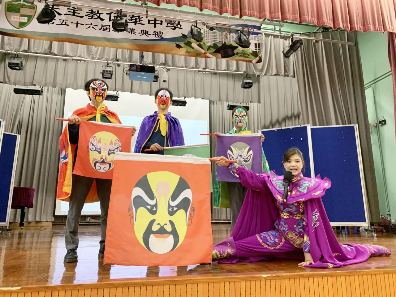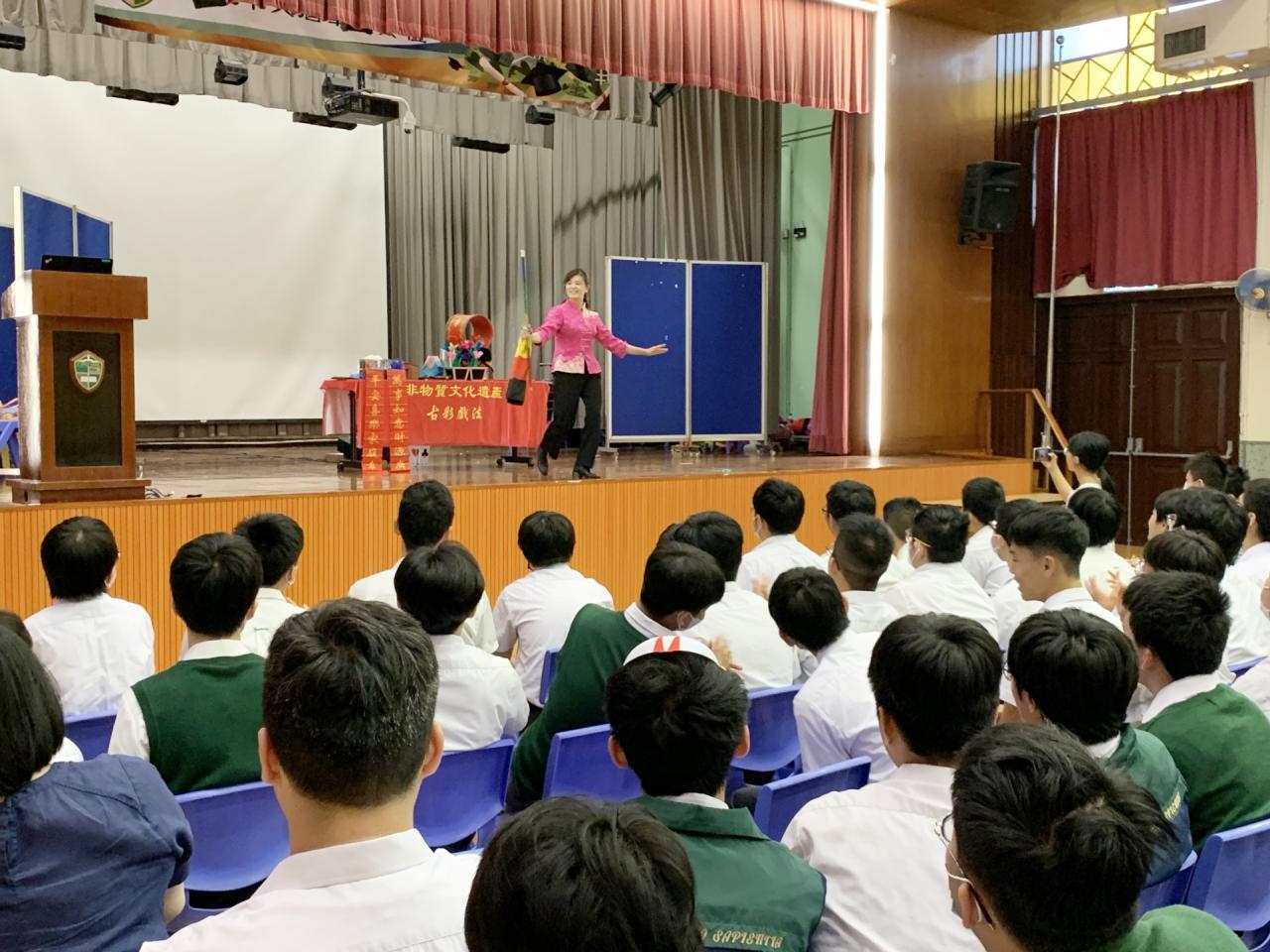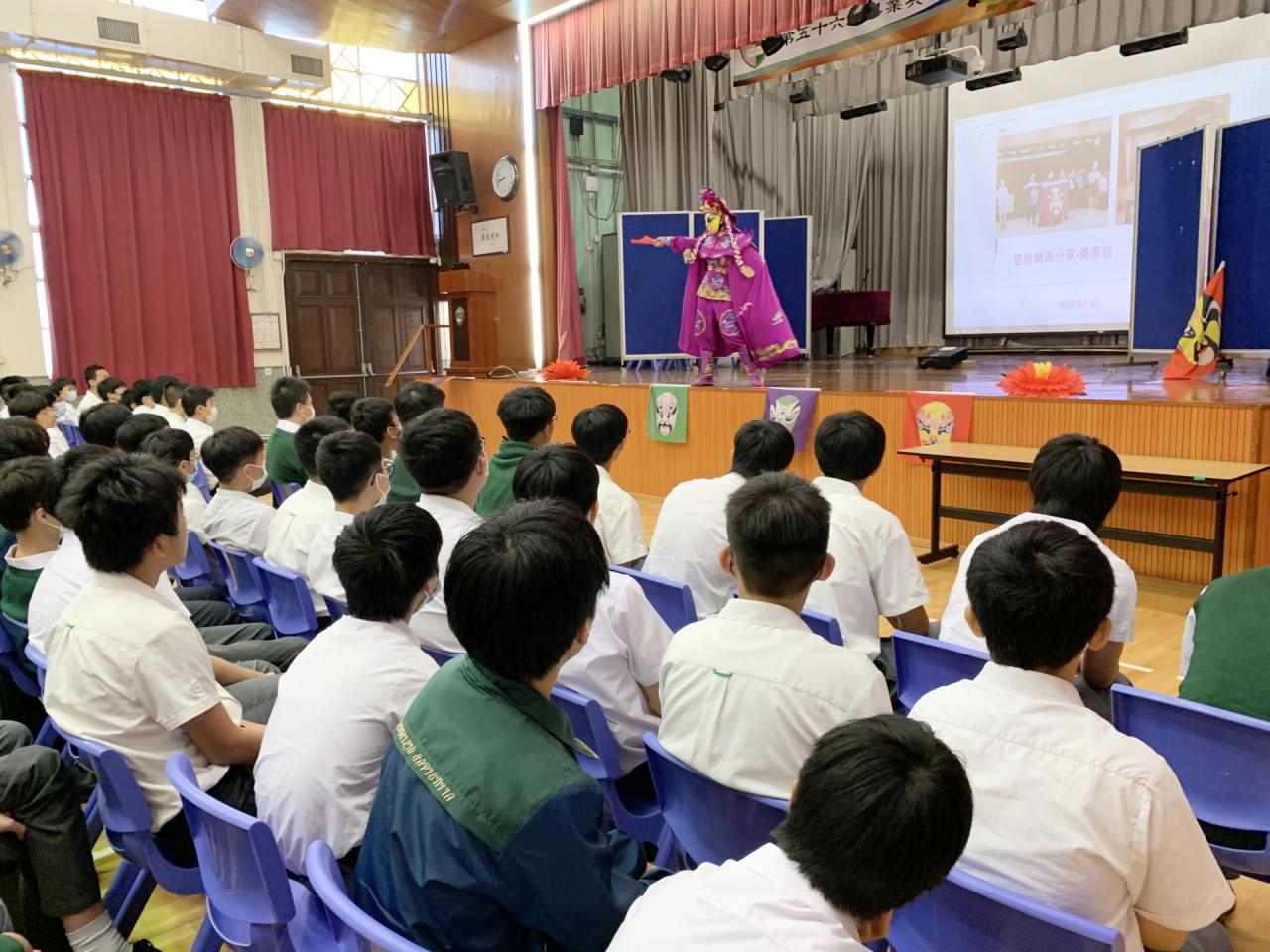 2023-04-09 為讓同學認識傳統藝術表演,感受傳統戲法的獨特表演藝術,中文科為中三級同學舉辦國藝表演,由資深變臉大師表演川劇變臉以及古彩戲法。活動當中同學有機會到台上與變臉師互動,親身體驗變臉和古代戲法的神奇之處。 活動剪影