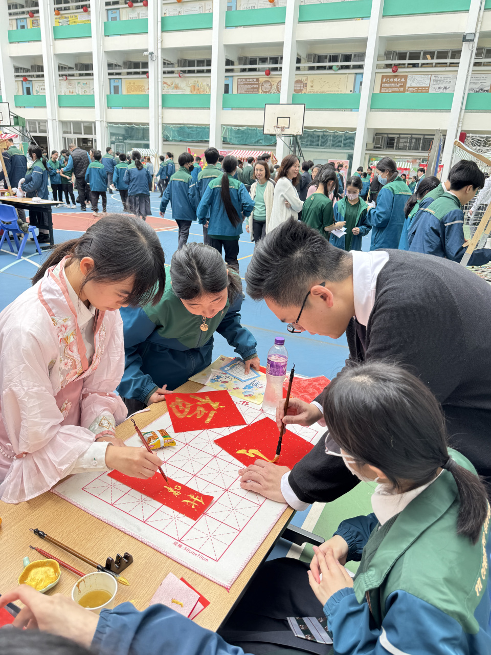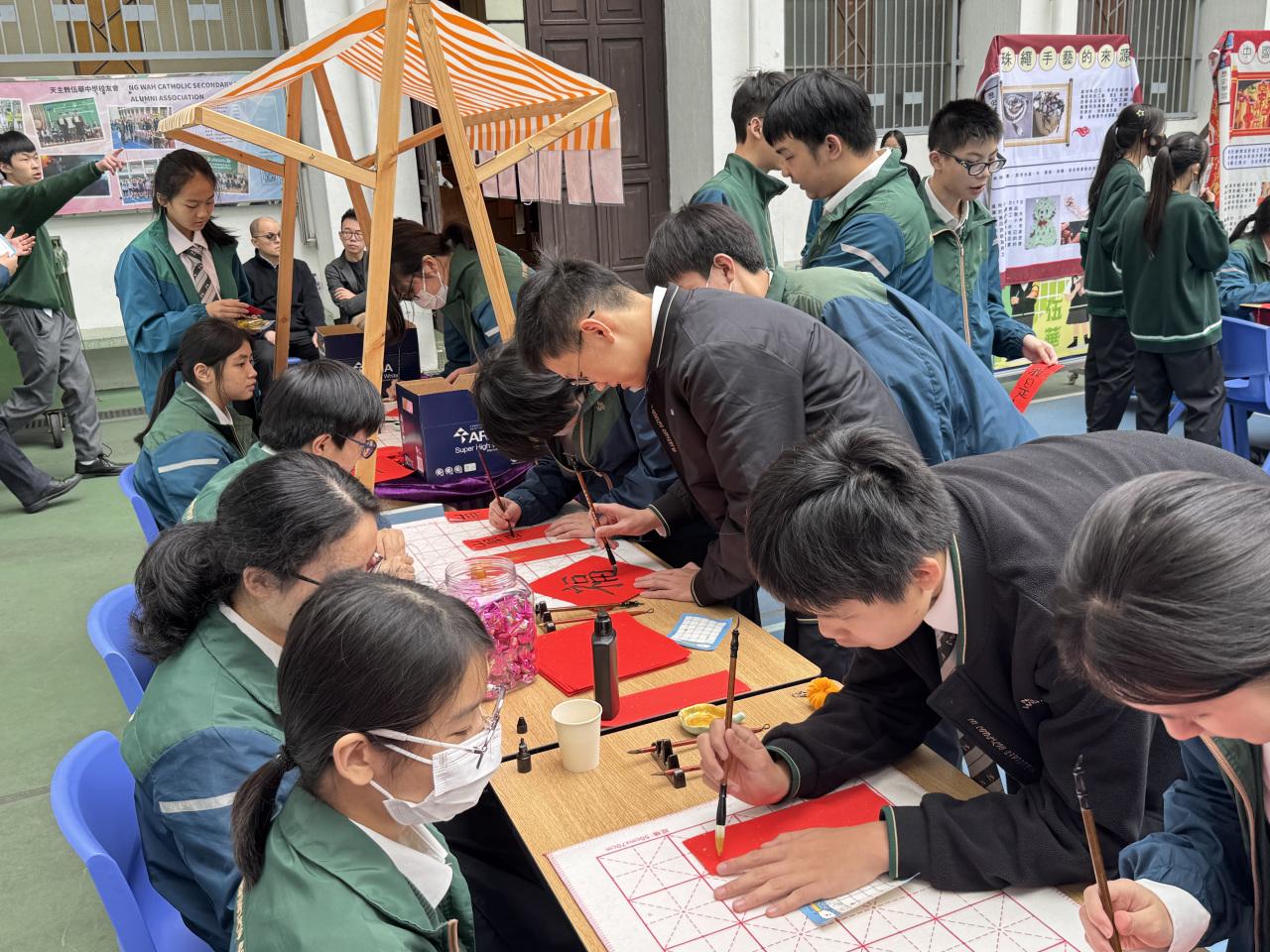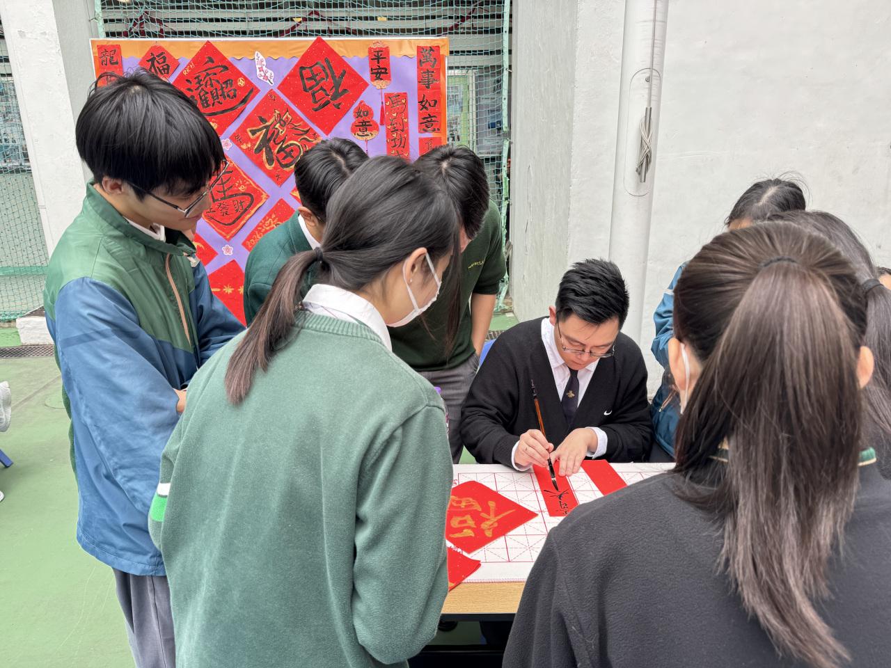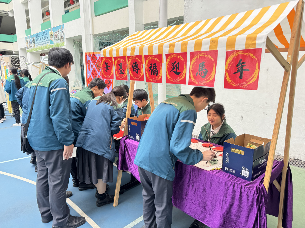 2026-02-12 本年度師生同樂迎新歲的寫揮春攤位主題為「筆墨傳福迎馬年」,活動中學生積極參與,透過親自體驗毛筆書寫揮春,認識寫揮春這一農曆新年傳統習俗,並將新年的願景揮灑於筆墨之間,為自己或他人送上一份新年祝福。 活動剪影