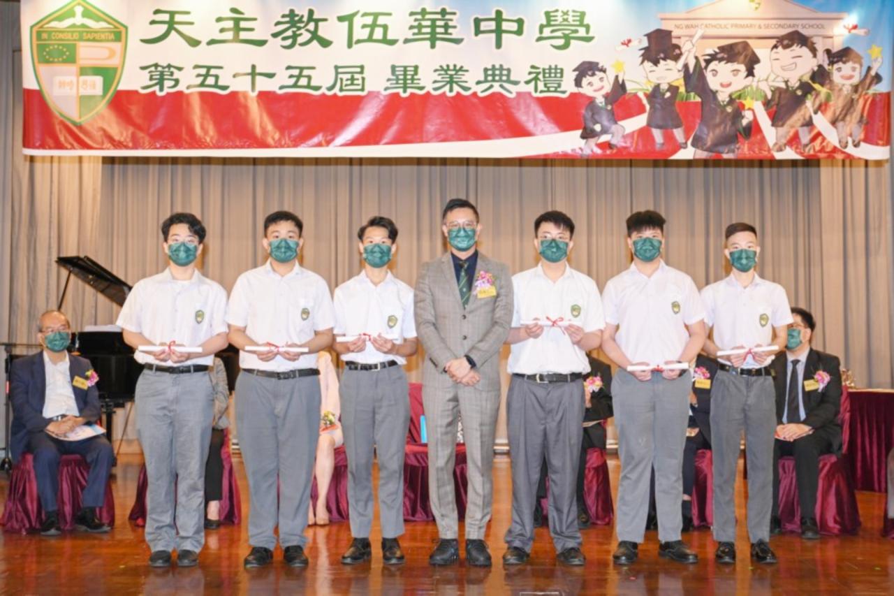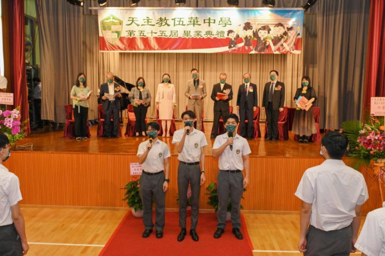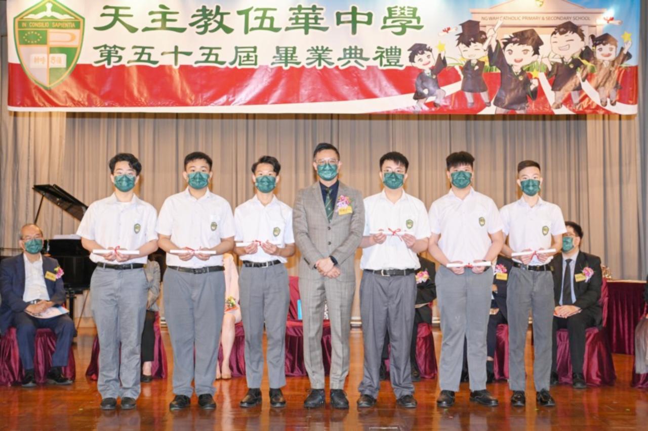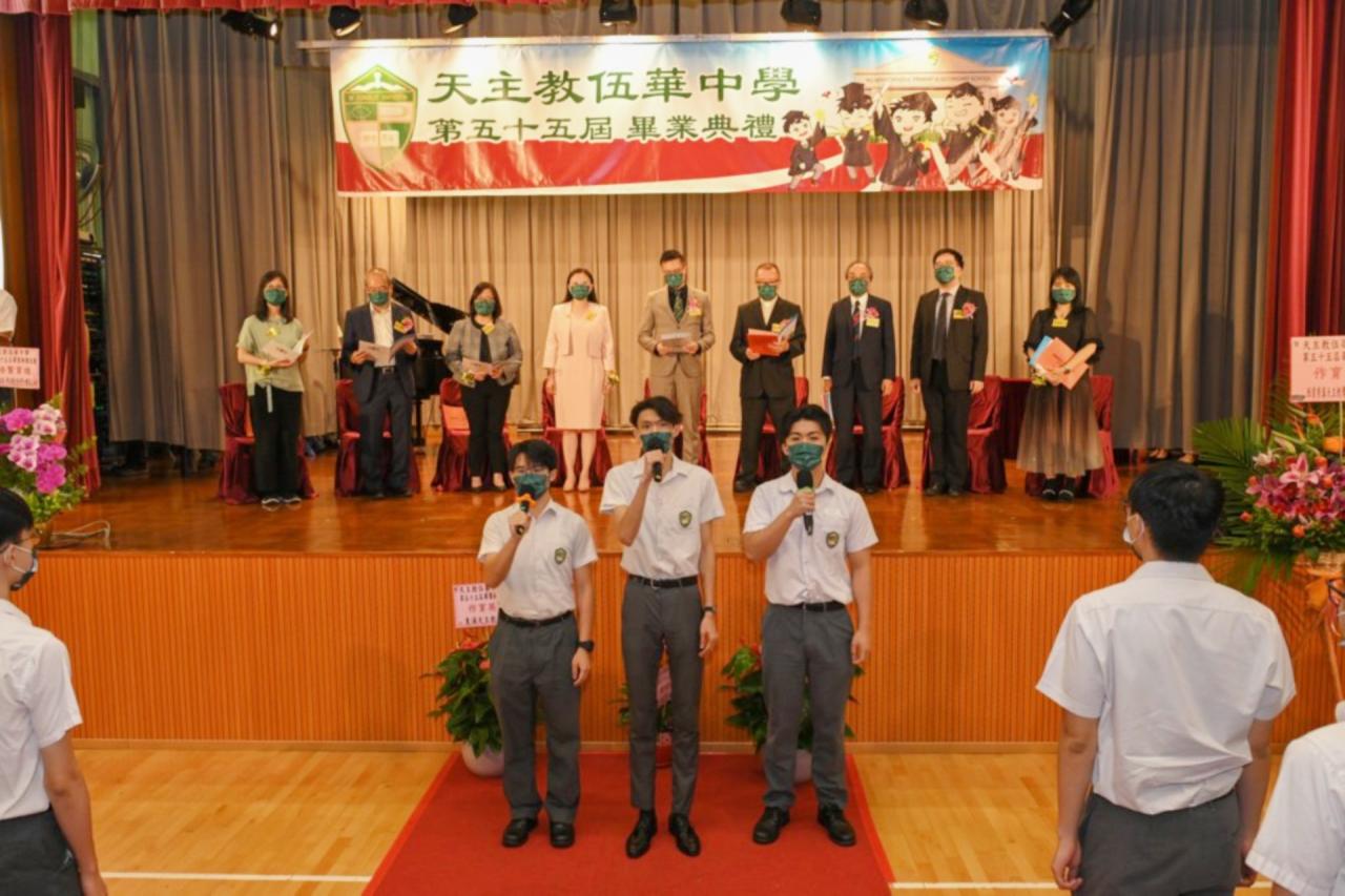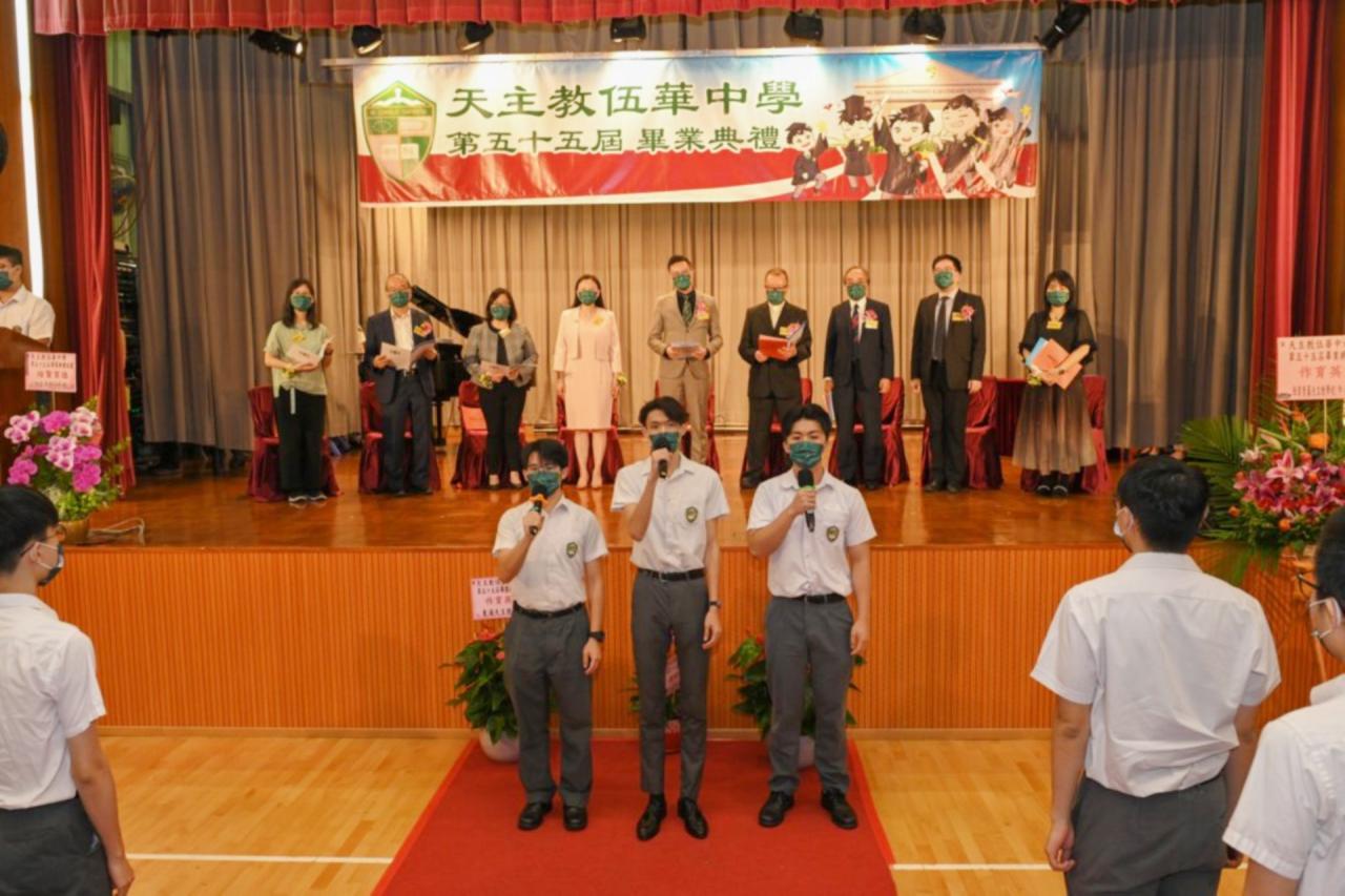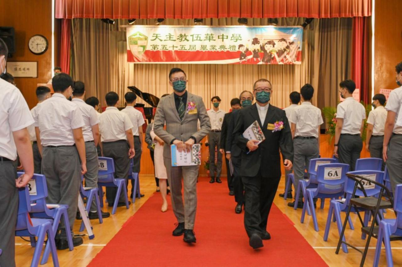 2022-06-25 第五十五屆畢業典禮於二零二二年六月二十五日隆重舉行。 典禮由校監陳德雄神父領禱開始,然後主禮嘉賓呂達文先生致訓辭,他勉勵學弟堅持追求自己夢想,保持熱情,終能邁向成功。接著呂達文先生向全體畢業生頒授畢業証書,而校監陳神父頒授教職員長期服務獎,感謝他們多年的努力付出,場內掌聲雷動,把整個畢業典禮氣氛推至高峰。 最後,畢業生代表潘慶文同學致辭,及向學校贈送紀念品,感謝師長關愛教導,感激家長和同學相知相伴,並銘記校訓慎思明辨,整個畢業典禮亦於全體師生合唱校歌下正式落幕。 活動剪影