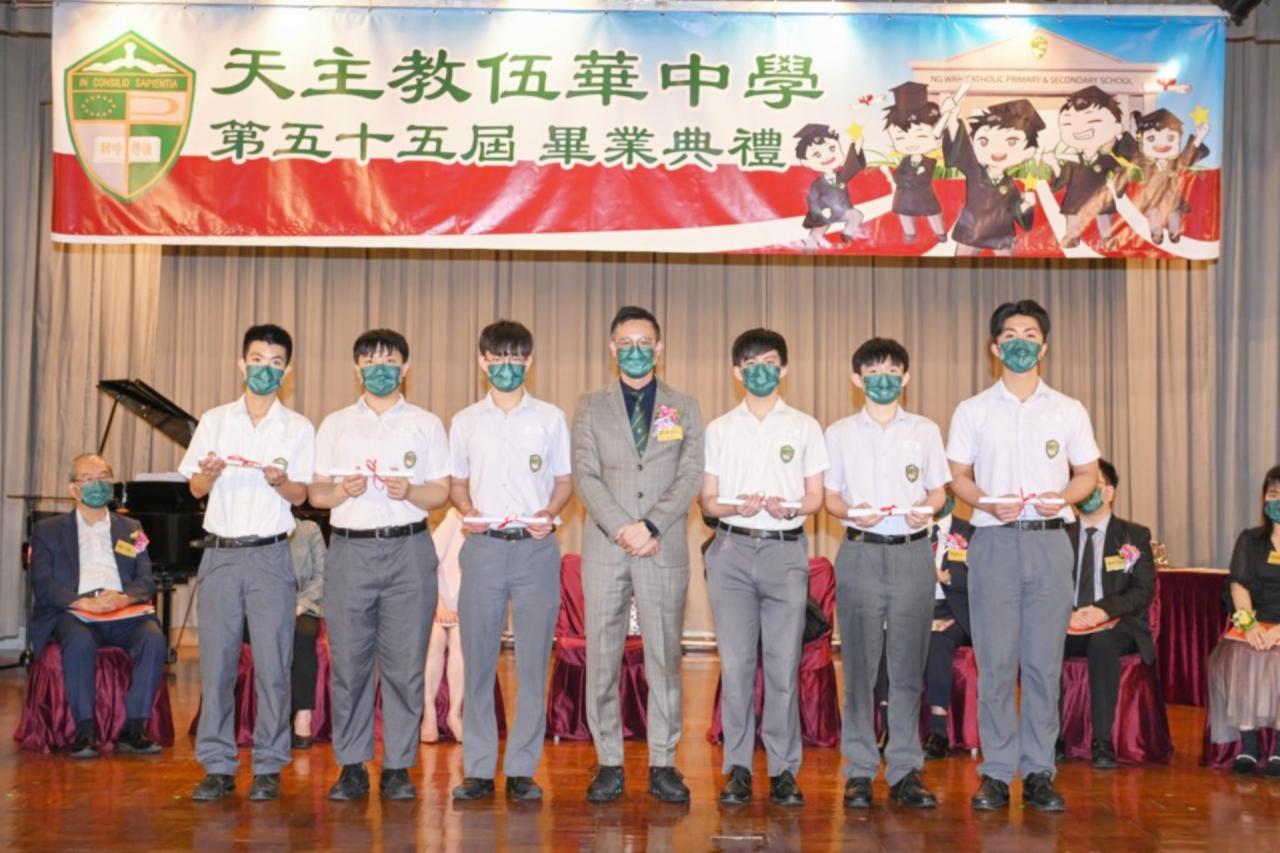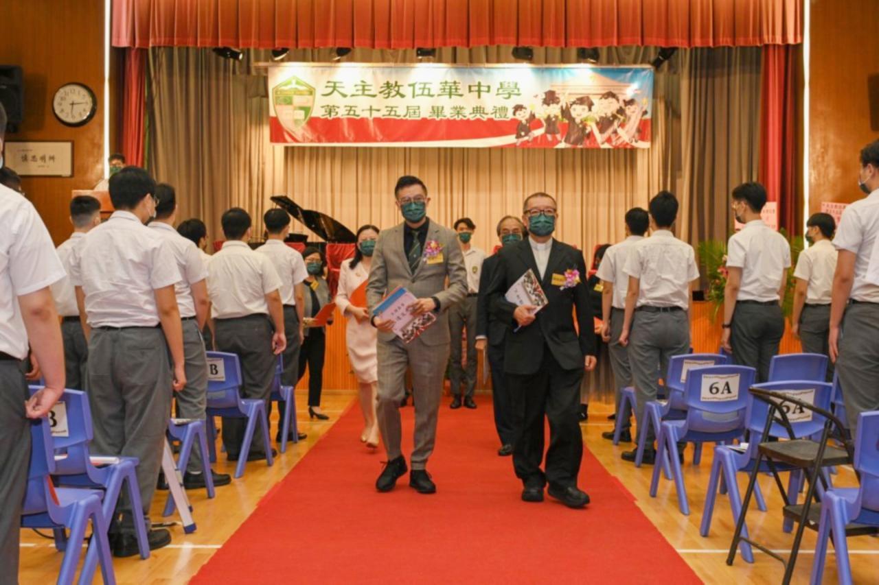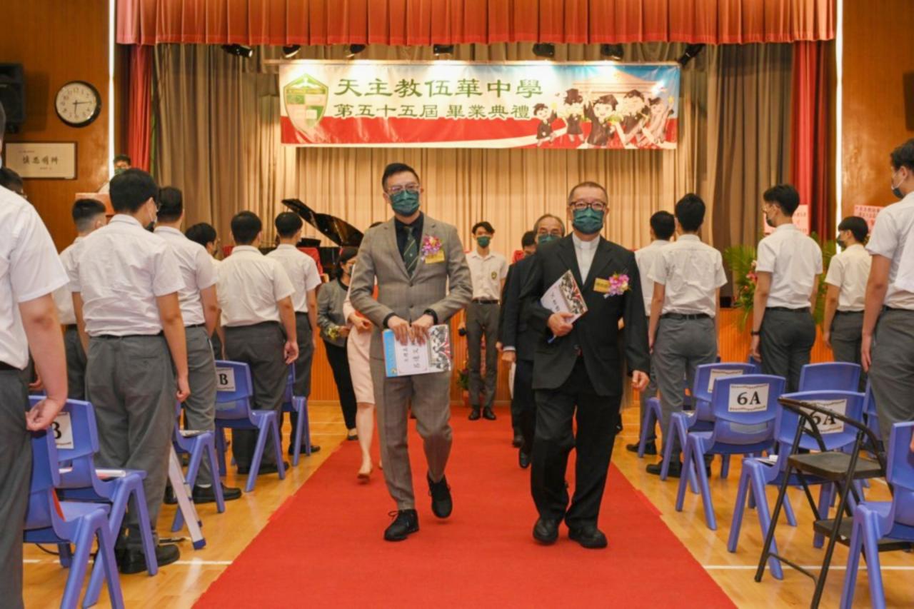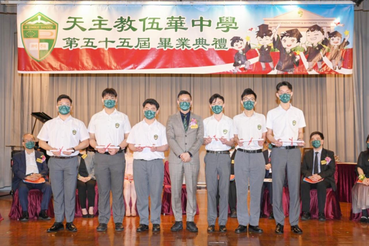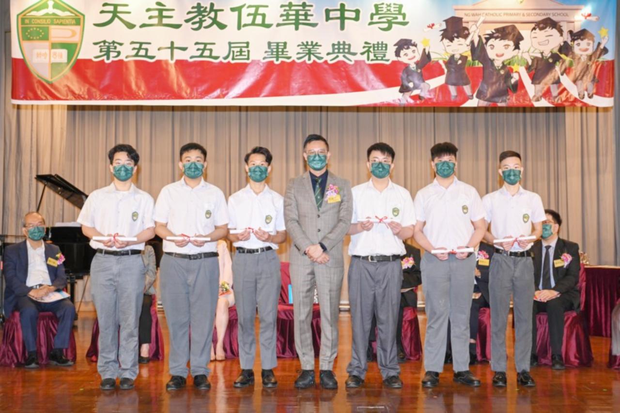 2022-06-25 第五十五屆畢業典禮於二零二二年六月二十五日隆重舉行。 典禮由校監陳德雄神父領禱開始,然後主禮嘉賓呂達文先生致訓辭,他勉勵學弟堅持追求自己夢想,保持熱情,終能邁向成功。接著呂達文先生向全體畢業生頒授畢業証書,而校監陳神父頒授教職員長期服務獎,感謝他們多年的努力付出,場內掌聲雷動,把整個畢業典禮氣氛推至高峰。 最後,畢業生代表潘慶文同學致辭,及向學校贈送紀念品,感謝師長關愛教導,感激家長和同學相知相伴,並銘記校訓慎思明辨,整個畢業典禮亦於全體師生合唱校歌下正式落幕。 活動剪影
