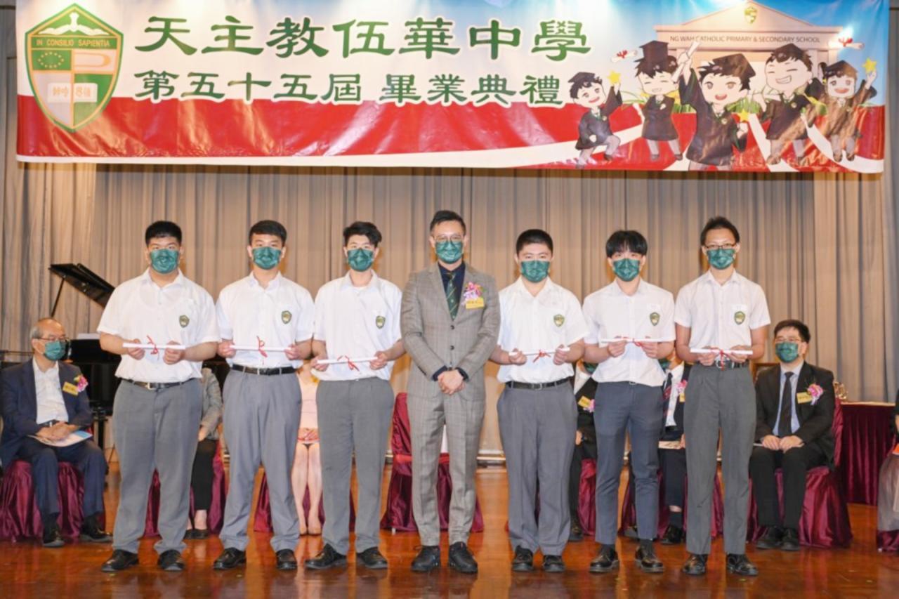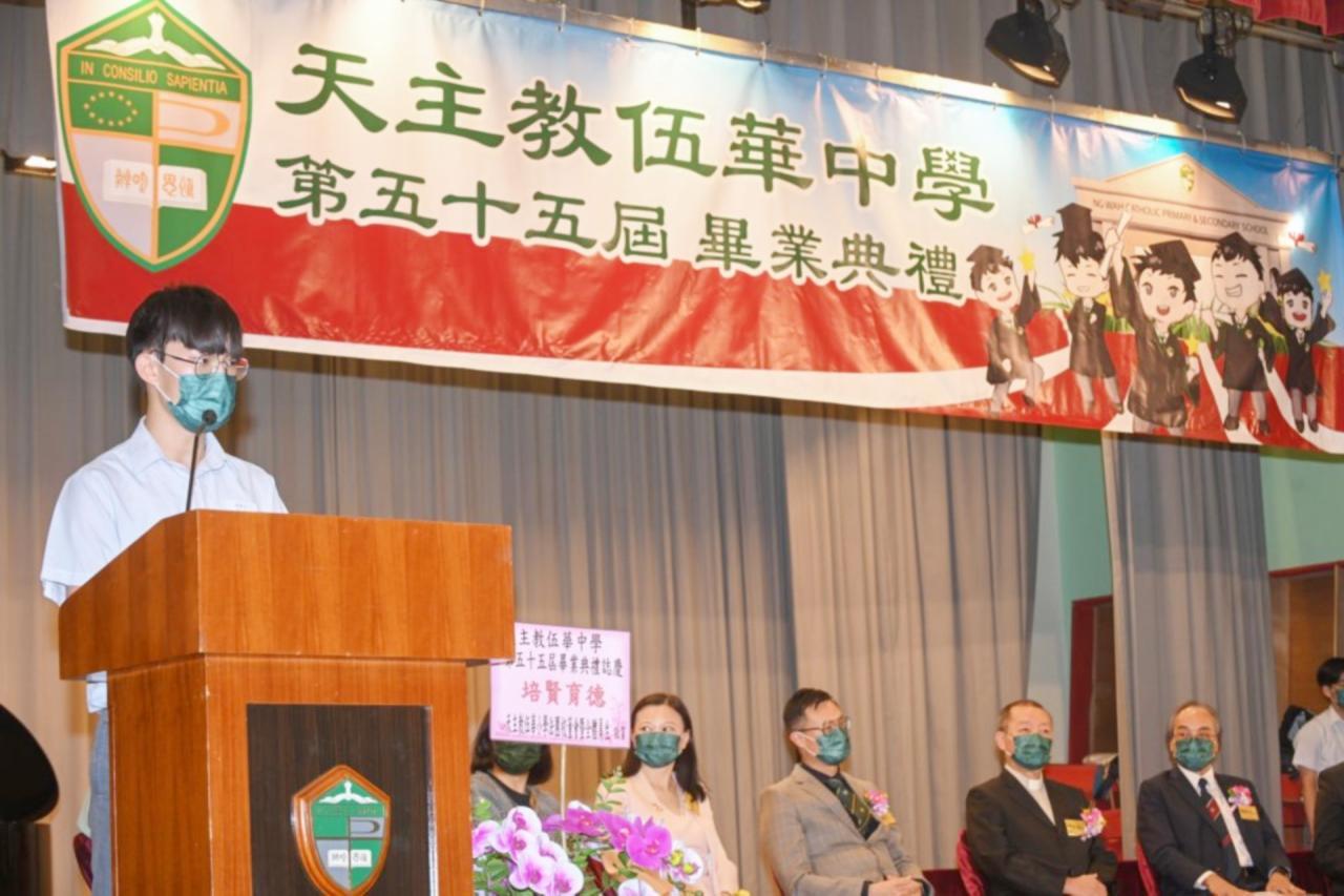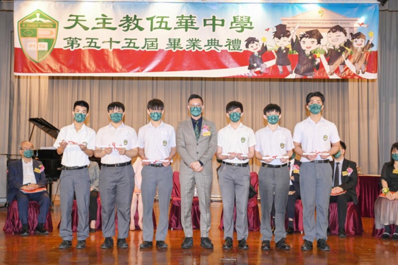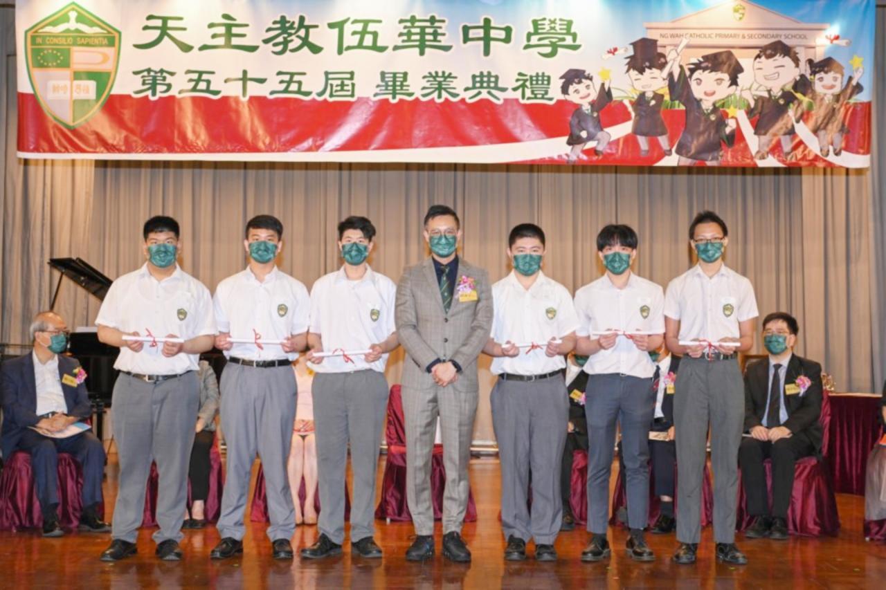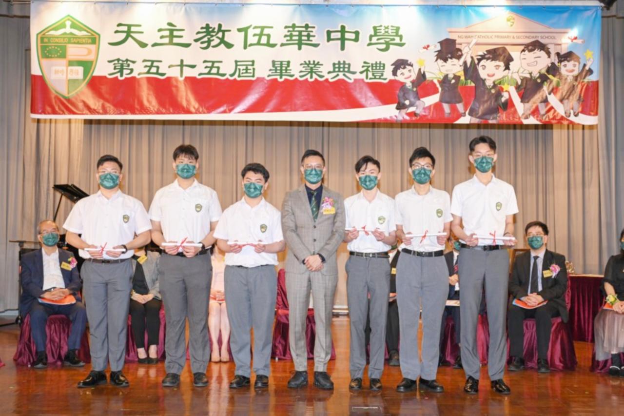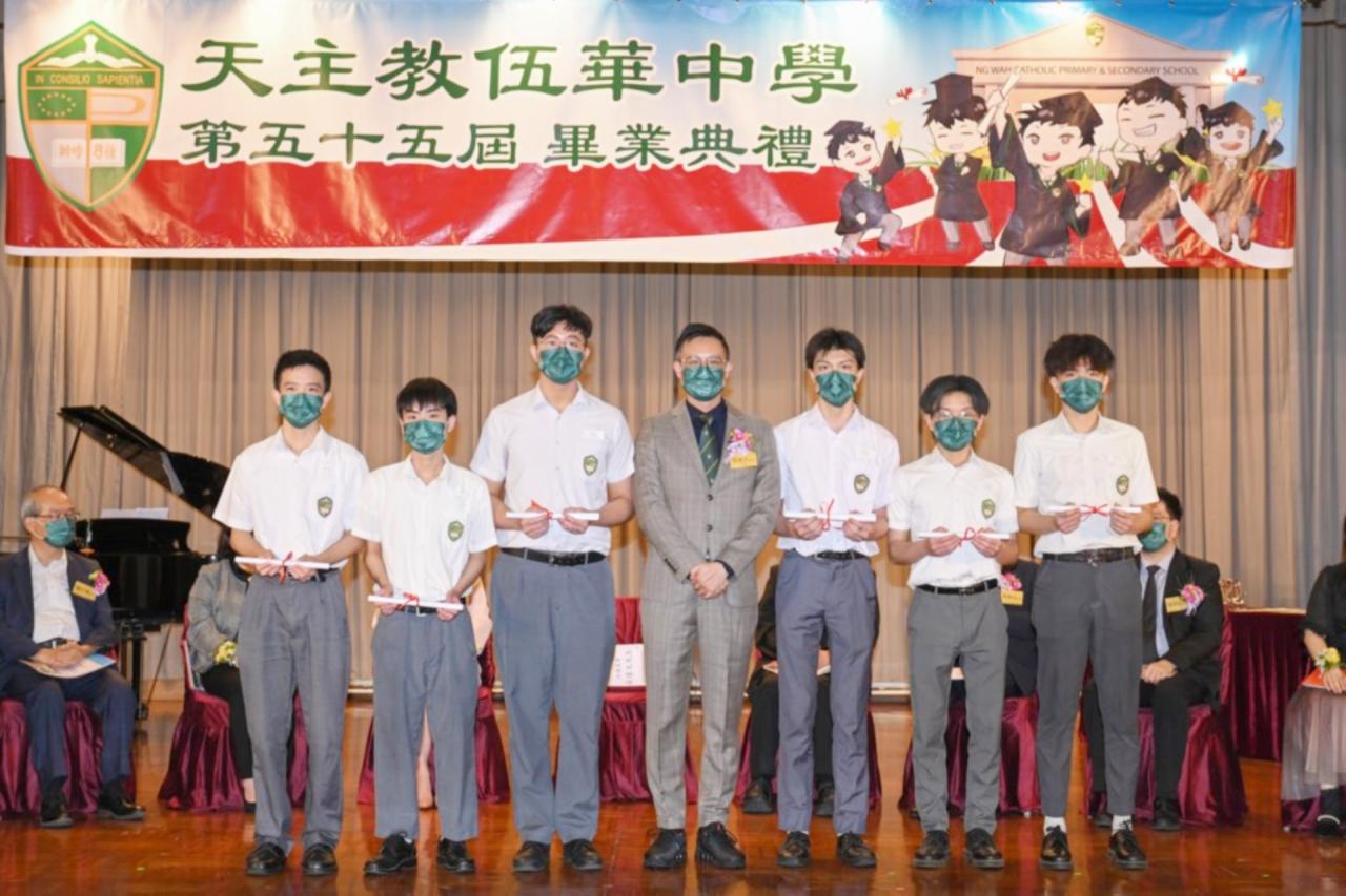 2022-06-25 第五十五屆畢業典禮於二零二二年六月二十五日隆重舉行。 典禮由校監陳德雄神父領禱開始,然後主禮嘉賓呂達文先生致訓辭,他勉勵學弟堅持追求自己夢想,保持熱情,終能邁向成功。接著呂達文先生向全體畢業生頒授畢業証書,而校監陳神父頒授教職員長期服務獎,感謝他們多年的努力付出,場內掌聲雷動,把整個畢業典禮氣氛推至高峰。 最後,畢業生代表潘慶文同學致辭,及向學校贈送紀念品,感謝師長關愛教導,感激家長和同學相知相伴,並銘記校訓慎思明辨,整個畢業典禮亦於全體師生合唱校歌下正式落幕。 活動剪影