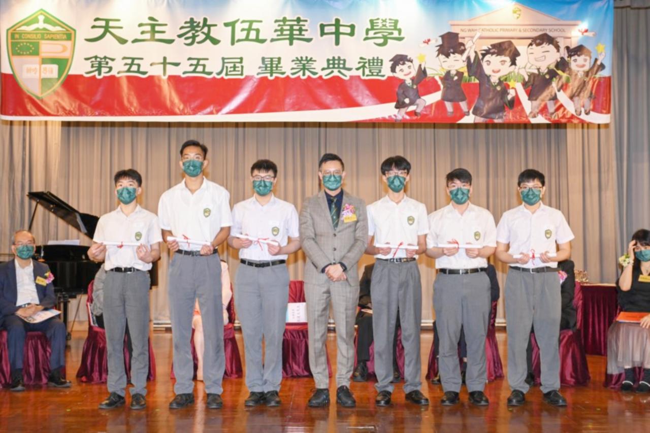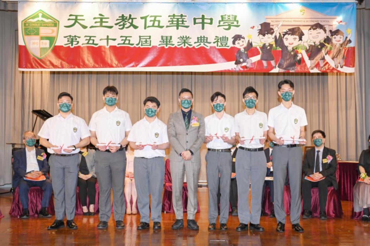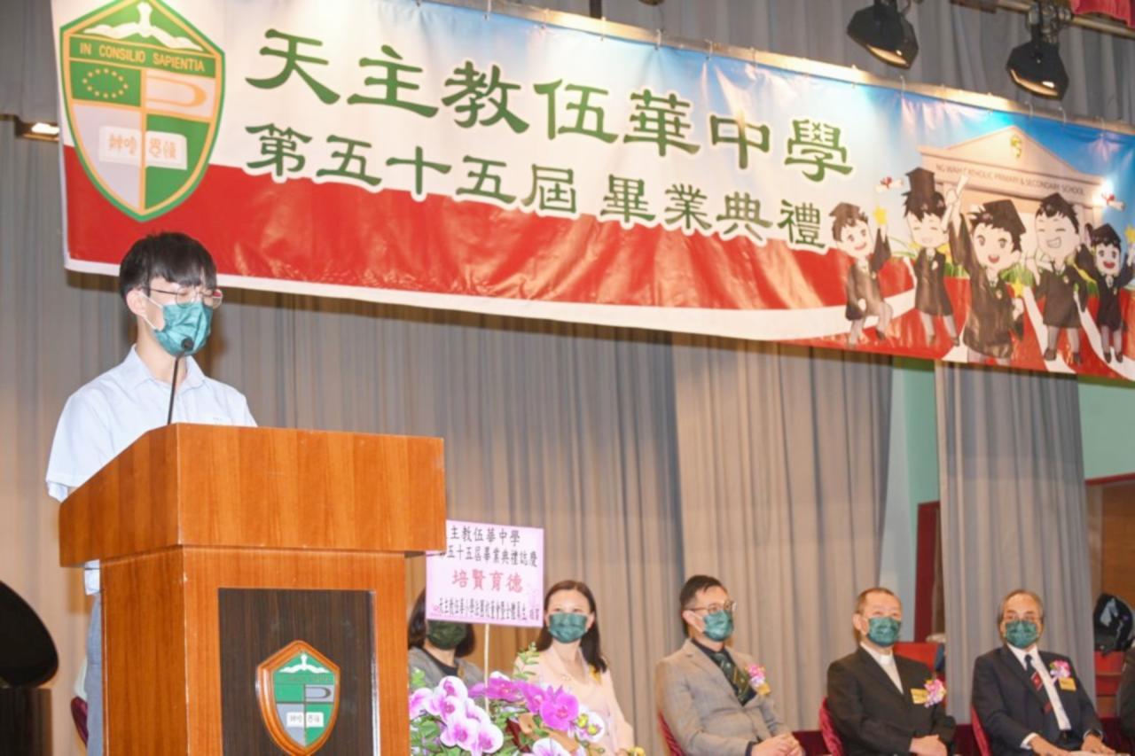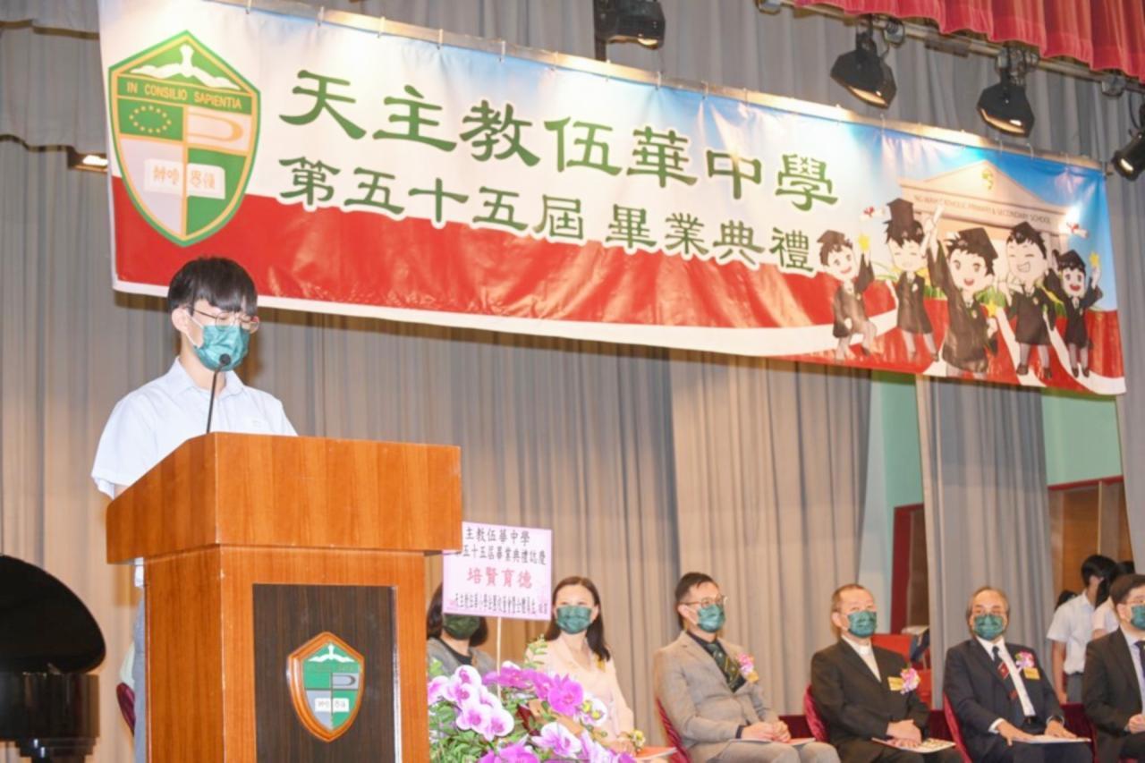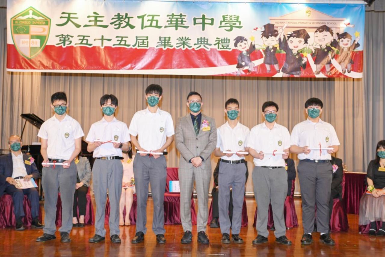 2022-06-25 第五十五屆畢業典禮於二零二二年六月二十五日隆重舉行。 典禮由校監陳德雄神父領禱開始,然後主禮嘉賓呂達文先生致訓辭,他勉勵學弟堅持追求自己夢想,保持熱情,終能邁向成功。接著呂達文先生向全體畢業生頒授畢業証書,而校監陳神父頒授教職員長期服務獎,感謝他們多年的努力付出,場內掌聲雷動,把整個畢業典禮氣氛推至高峰。 最後,畢業生代表潘慶文同學致辭,及向學校贈送紀念品,感謝師長關愛教導,感激家長和同學相知相伴,並銘記校訓慎思明辨,整個畢業典禮亦於全體師生合唱校歌下正式落幕。 活動剪影