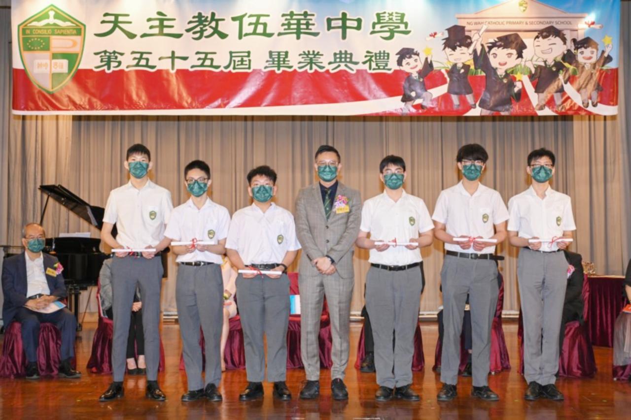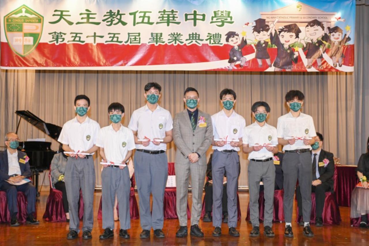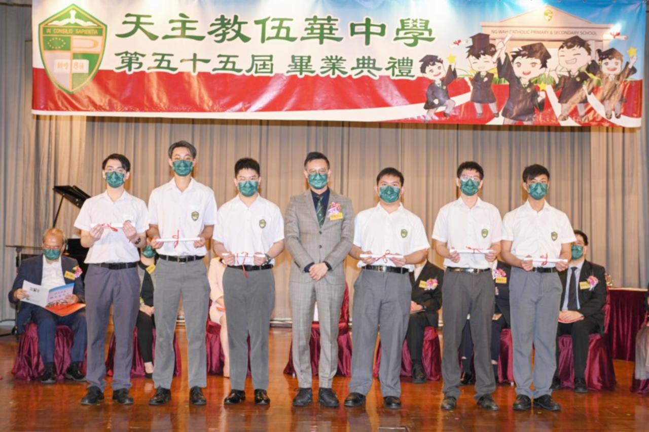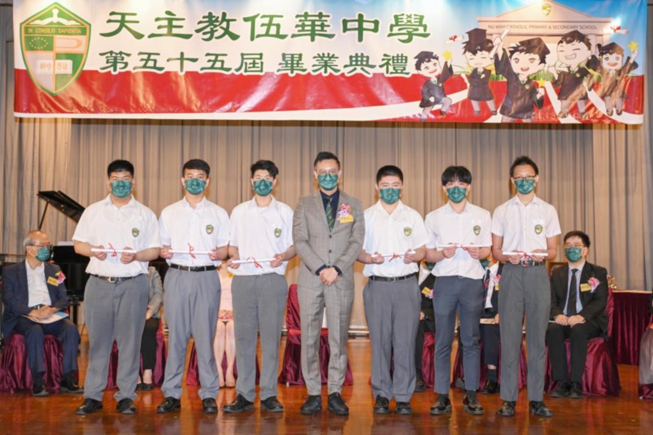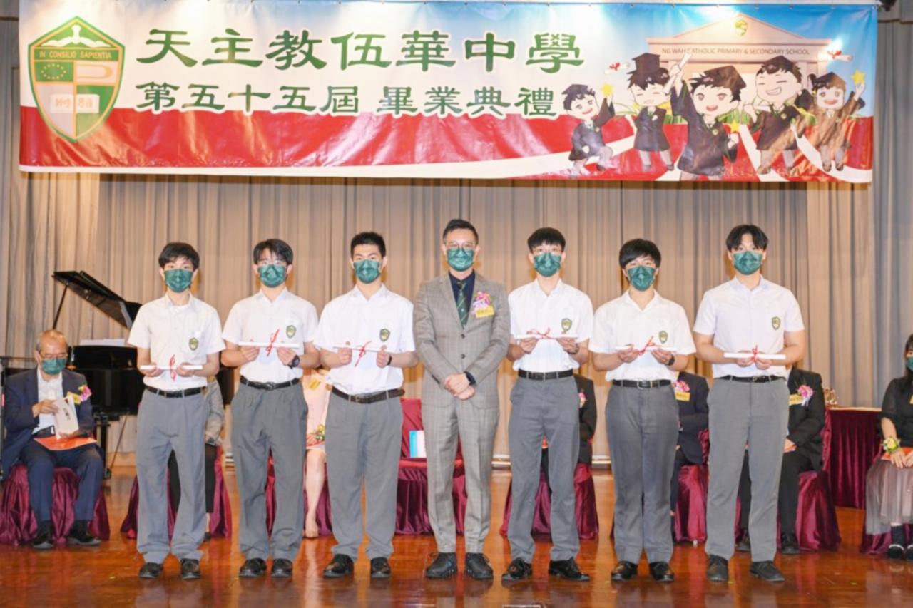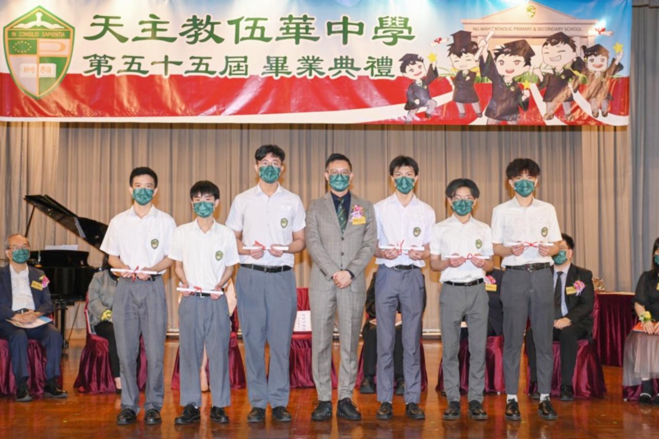 2022-06-25 第五十五屆畢業典禮於二零二二年六月二十五日隆重舉行。 典禮由校監陳德雄神父領禱開始,然後主禮嘉賓呂達文先生致訓辭,他勉勵學弟堅持追求自己夢想,保持熱情,終能邁向成功。接著呂達文先生向全體畢業生頒授畢業証書,而校監陳神父頒授教職員長期服務獎,感謝他們多年的努力付出,場內掌聲雷動,把整個畢業典禮氣氛推至高峰。 最後,畢業生代表潘慶文同學致辭,及向學校贈送紀念品,感謝師長關愛教導,感激家長和同學相知相伴,並銘記校訓慎思明辨,整個畢業典禮亦於全體師生合唱校歌下正式落幕。 活動剪影