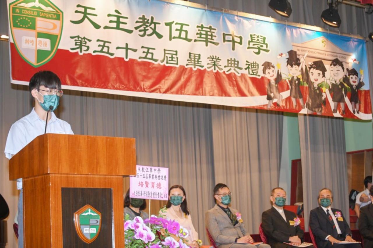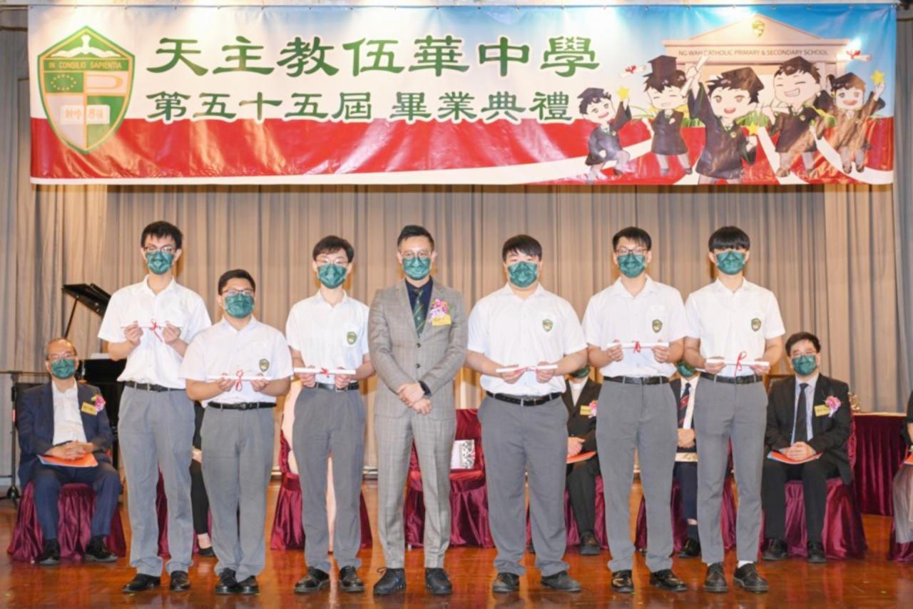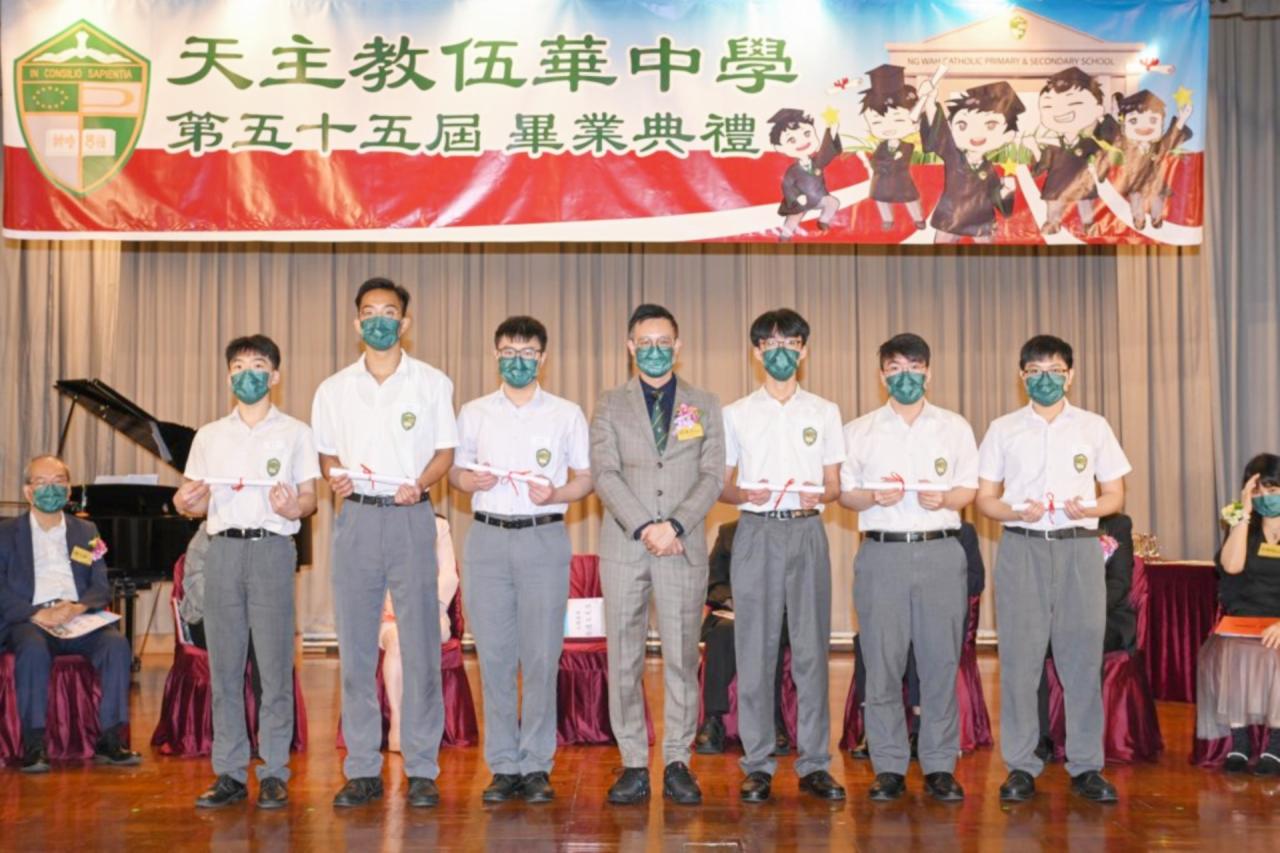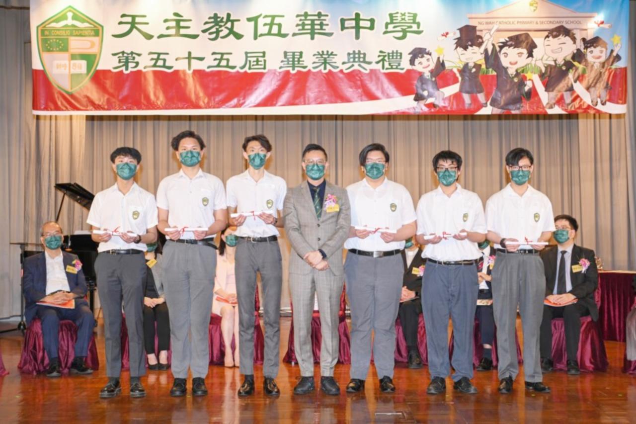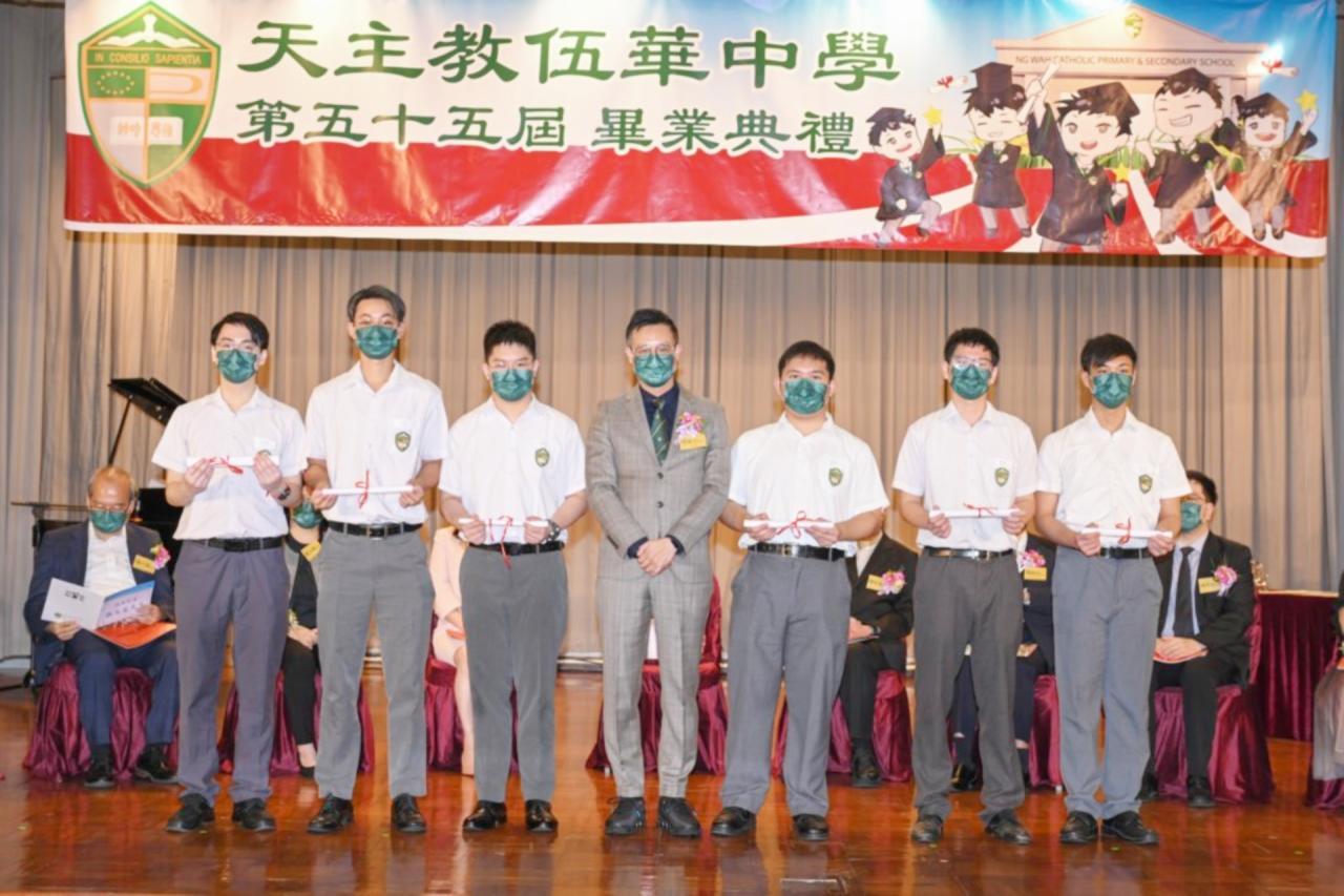 2022-06-25 第五十五屆畢業典禮於二零二二年六月二十五日隆重舉行。 典禮由校監陳德雄神父領禱開始,然後主禮嘉賓呂達文先生致訓辭,他勉勵學弟堅持追求自己夢想,保持熱情,終能邁向成功。接著呂達文先生向全體畢業生頒授畢業証書,而校監陳神父頒授教職員長期服務獎,感謝他們多年的努力付出,場內掌聲雷動,把整個畢業典禮氣氛推至高峰。 最後,畢業生代表潘慶文同學致辭,及向學校贈送紀念品,感謝師長關愛教導,感激家長和同學相知相伴,並銘記校訓慎思明辨,整個畢業典禮亦於全體師生合唱校歌下正式落幕。 活動剪影