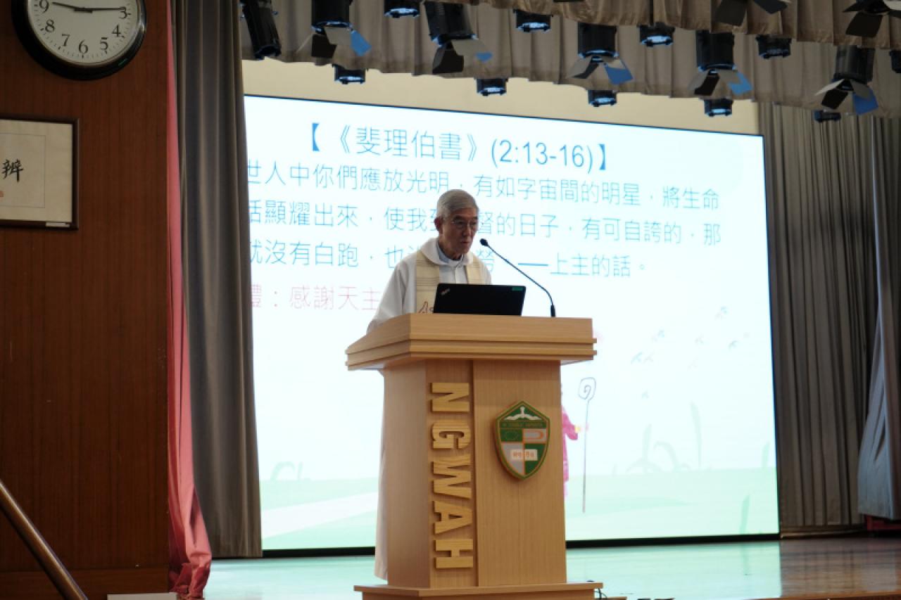 2025-09-03 天主教伍華中學開學祈禱會已於9月3日舉行,當日由校董林銘神父主持。林神父在祈禱會的講道中引用了經文「在世人中你們應放光明,有如字宙間的明星,將生命的話顯耀出來。」來鼓勵學生善用自己的才能,令自己的生命猶如天`天上的明星照亮自己照亮他人。 活動剪影