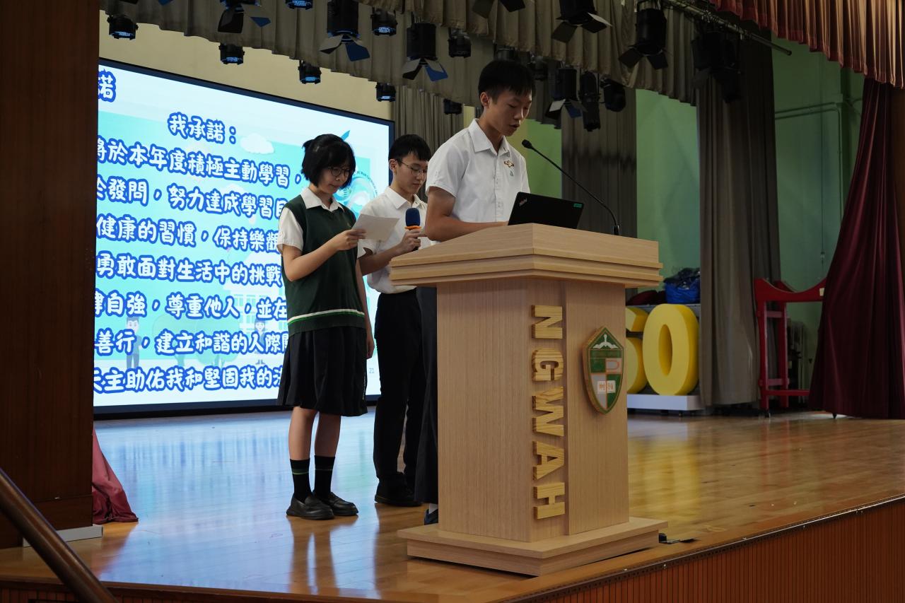 2025-09-01 天主教伍華中學2025至2026年度開學典禮於9月1日進行,李宛儀校長介紹今年加入伍華大家庭的新成員及學校發展及行政組老師,並致訓勉辭,勉勵同學要成功必須持之以恆。及後總領袖生長梁彥希帶領同學許諾,同學承諾積極主動學習,努力達成學習目標,並在日常生活中實踐善行。 活動剪影