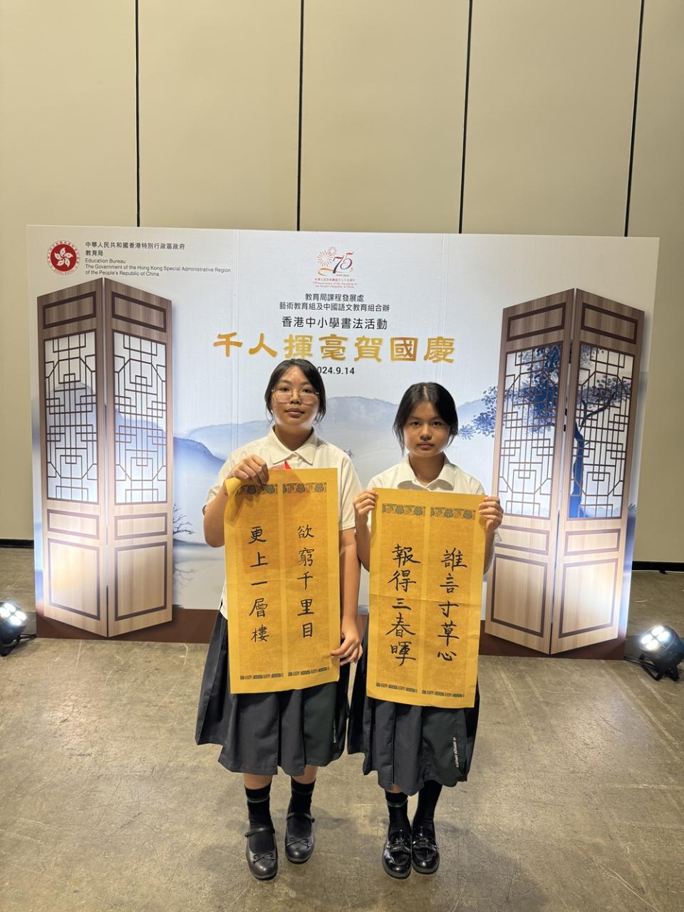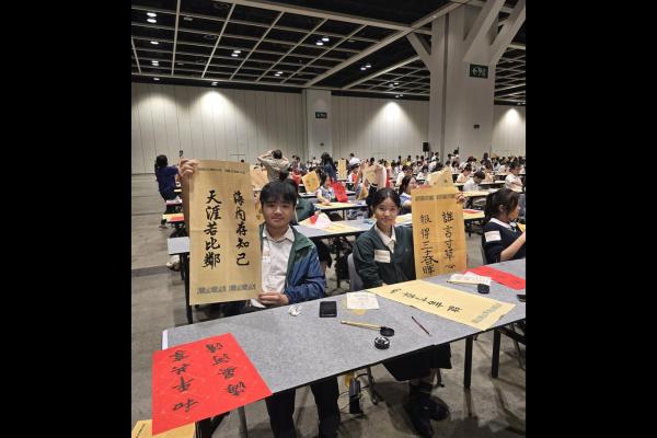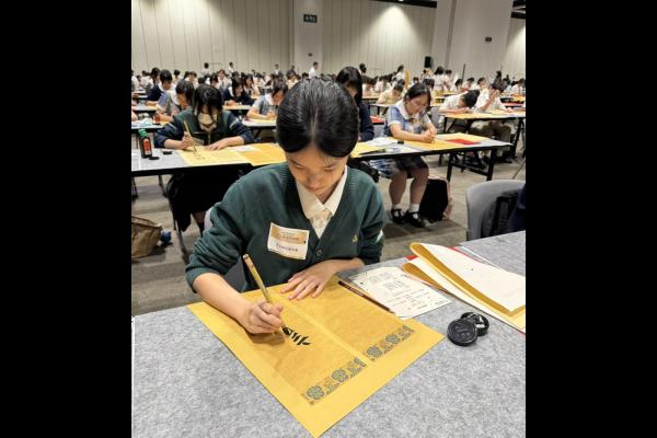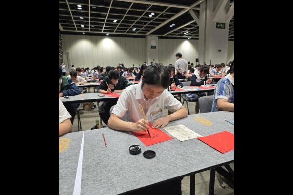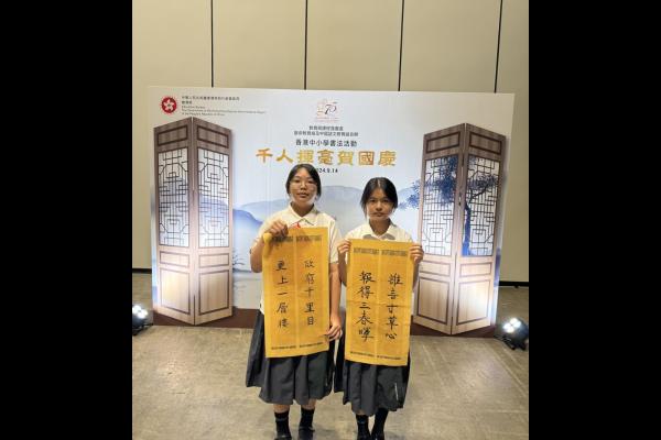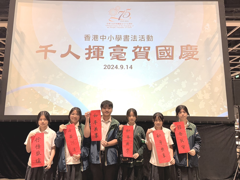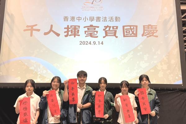 本校於2024年9月14日參加由教育局舉辦的「千人揮毫賀國慶」活動,慶祝中華人民共和國成立75周年。是次活動分別有2C班何麗雯,2D班林紫微,以及3B班歐陽天慈、李熙兒、李芷殷及梁梓洋同學參與。 活動逾1800名來自142所中小學的學生齊聚一堂,與300位校長、教師及嘉賓一同揮毫。署理教育局局長施俊輝先生在致辭中強調書法藝術作為中華文化瑰寶的重要性。本校學生書寫「國泰民安」、「和平共享」等祝福字詞,以及詩句,不僅展現了對書法藝術的熱愛,更表達了對祖國的祝福。 是次活動不僅讓學生們親身體驗中華文化的魅力,也培養了他們的文化素養和愛國情懷。本校將繼續支持類似活動,助力學生全面發展。