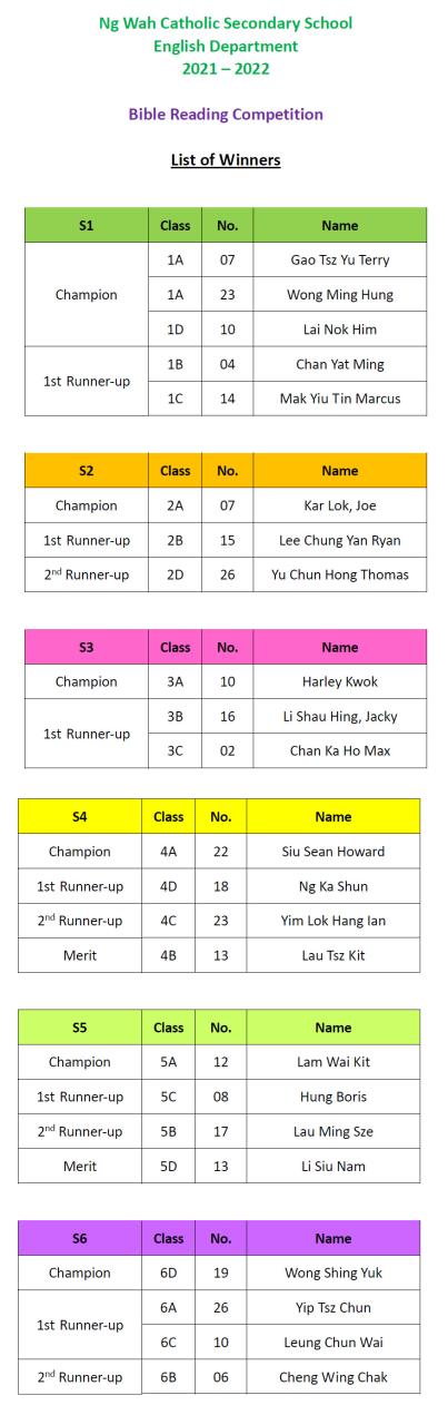 It is the honour of the English Department to invite our Vice-Principal, Mr W Wai, and our NET, Mr R Dallas, to present the prizes to all the champions and winners of the Bible Reading Competition 2021 – 2022.