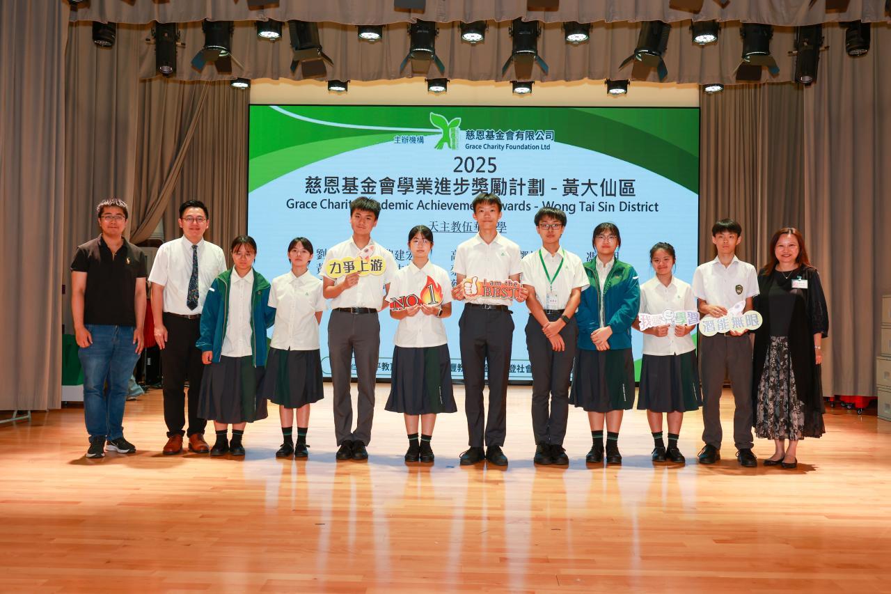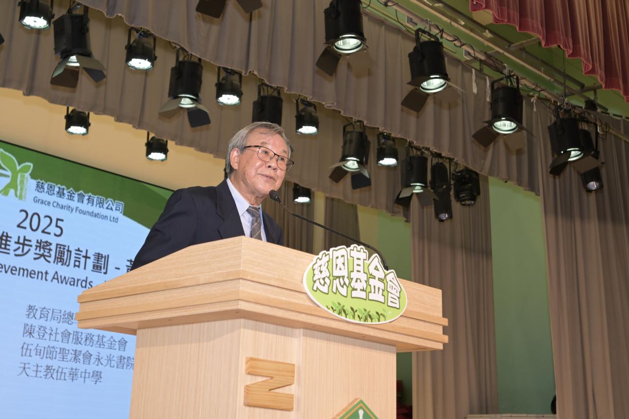 2025-09-27 「2025慈恩基金會學業進步獎勵計劃」頒獎典禮為激勵同學自我完善、力臻卓越,慈恩基金會積極支援學界,更慷慨捐助獎學金予學業成績有明顯進步及品行優良的同學。於2024-2025年度,本校共15名同學表現傑出,並成功獲獎。 為隆重其事,慈恩基金會於2025年9月27日,假本校禮堂舉辦了「2025慈恩基金會學業進步獎勵計劃」頒獎典禮,教育局總學校發展主任(黃大仙)馮俊文先生、陳登社會服務基金會陳玉坤女士、伍旬節聖潔會永光書院郭文坤校長、本校李宛儀校長暨各校校長及師生都抽空出席,場面熱鬧。
