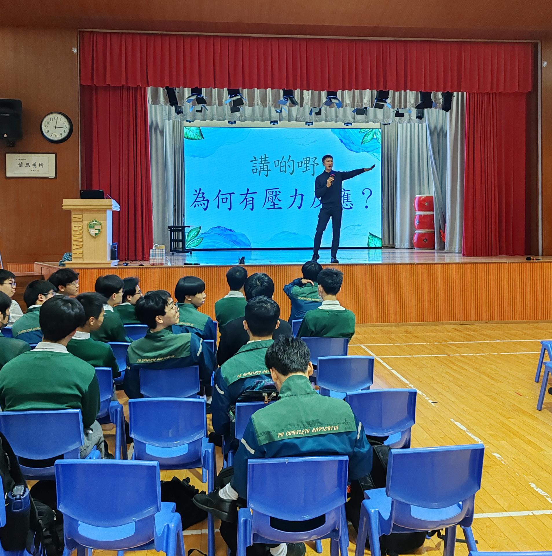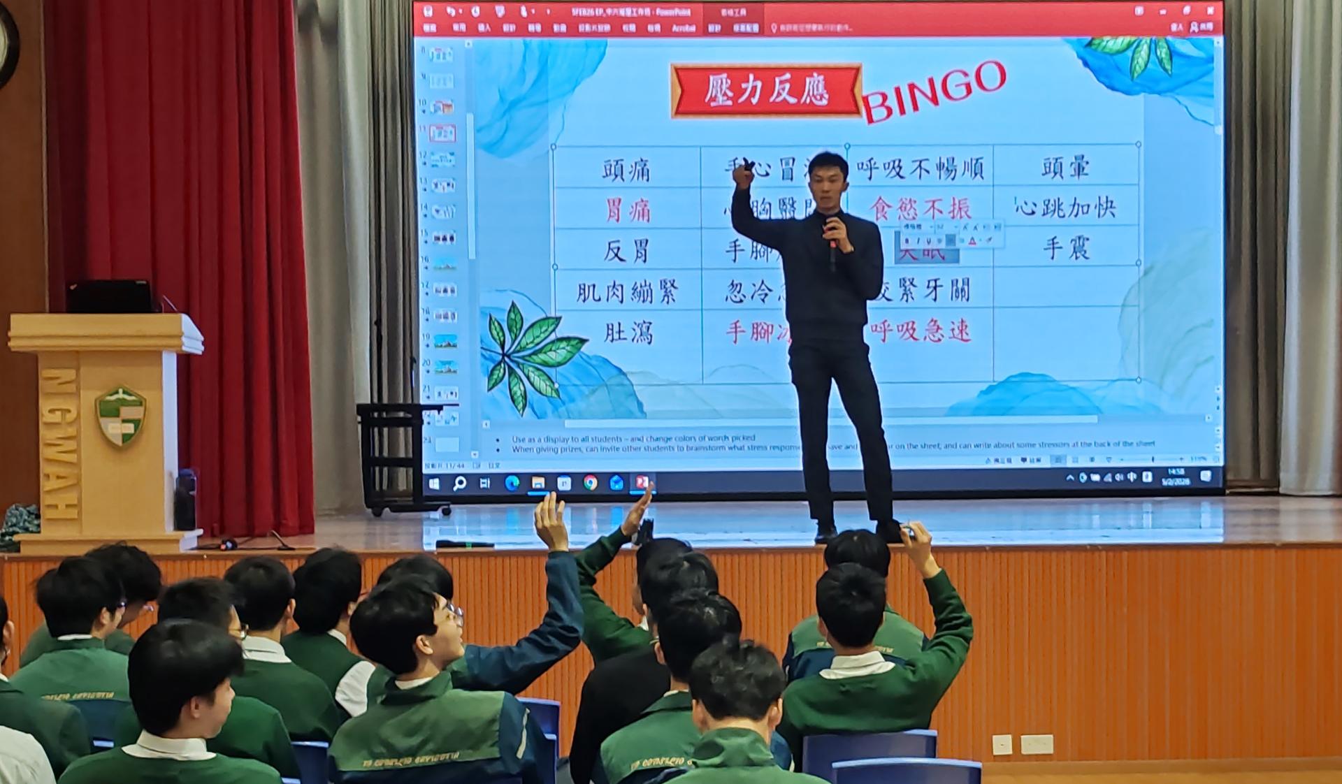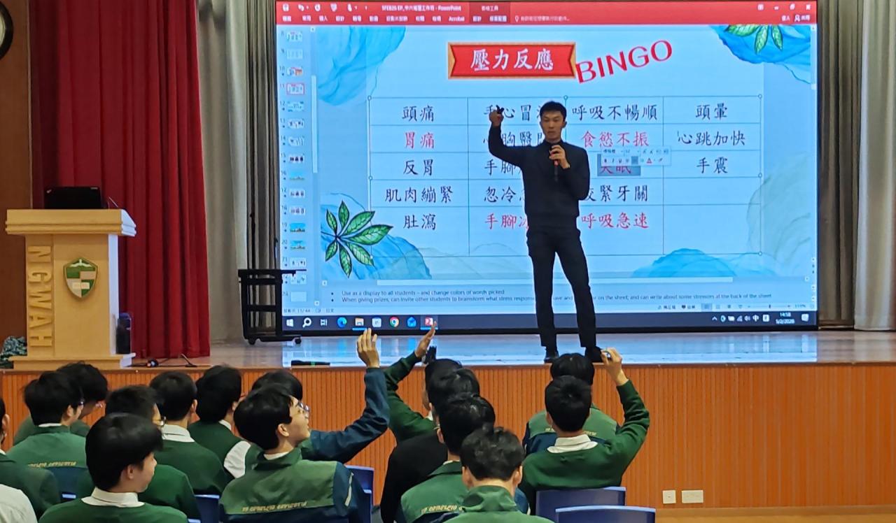 活動讓學生認識壓力反應類型、於壓力時的身體反應及行為傾向,最後與同學一起進行呼吸練習,給同學一個有效的方法舒緩壓力。
